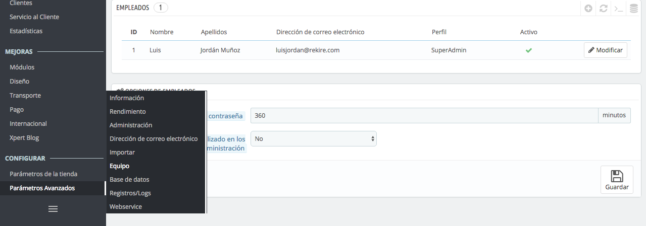 Luisejo Posted December 4, 2017 Share Posted December 4, 2017 Hola Weedmen, a ver si te puedo ayudar. Si eres super-administrador de la tienda deberías visualizar en el menú lateral izquierdo lo siguiente. Entras en Parámetros Avanzados -> Equipo y ahí es donde se lista el personal que supuestamente está trabajando en la tienda. Creo que con esto puedes solucionar el problema de cambio de email de una cuenta. Link to comment Share on other sites More sharing options...