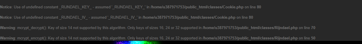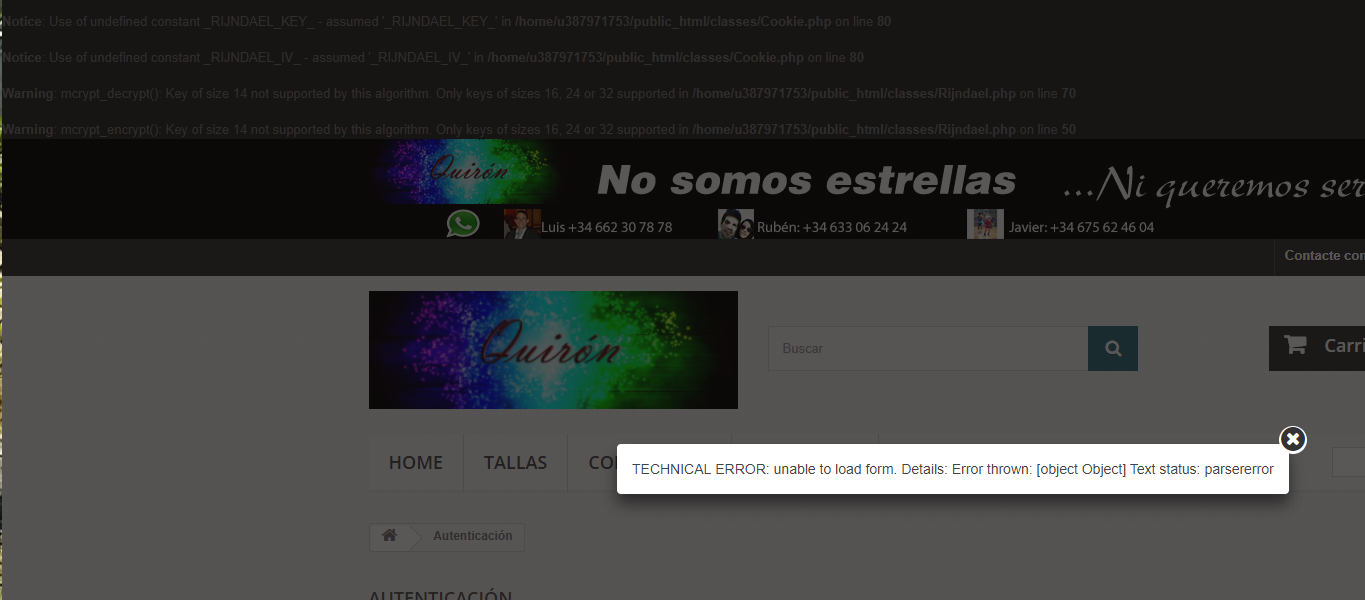 Ledwis Posted December 4, 2017 Author Share Posted December 4, 2017 Gracias por tu pronta rspuesta, Solo entrando tengo las siguientes noticias: Notice: Use of undefined constant _RIJNDAEL_KEY_ - assumed '_RIJNDAEL_KEY_' in /home/u387971753/public_html/classes/Cookie.php on line 80 Notice: Use of undefined constant _RIJNDAEL_IV_ - assumed '_RIJNDAEL_IV_' in /home/u387971753/public_html/classes/Cookie.php on line 80 Warning: mcrypt_decrypt(): Key of size 14 not supported by this algorithm. Only keys of sizes 16, 24 or 32 supported in /home/u387971753/public_html/classes/Rijndael.php on line 70 Ahora cuanto me meto: Exactamente lo mismo... Todo se queda tal cual: Link to comment Share on other sites More sharing options...
