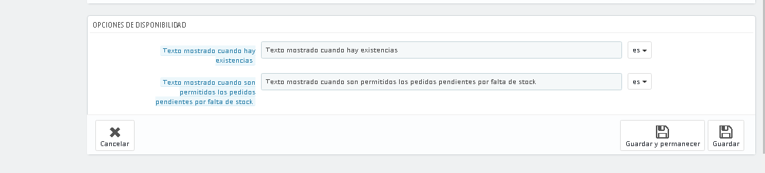 nadie Posted December 5, 2017 Share Posted December 5, 2017 (edited) ¿Hablamos de la ficha del producto? ¿tambien del listado? ¿o solo de la ficha del producto? En las fichas de edición de los productos en el panel de administración tienes una opción llamada: "Texto mostrado cuando hay existencias" y "Texto mostrado cuando son permitidos los pedidos pendientes por falta de stock" Adjunto Captura Por ejemplo este texto en la ficha del producto, se ve de la siguiente forma: Adjunto Captura El campo en cuestión también puedes actualizarlo en la base de datos (update) de forma masiva (lo digo por si quieres actualizarlo para todos los productos y no ir uno a uno) tabla: ps_product_lang campo -> available_now (Texto mostrado cuando hay existencias), campo -> available_later (Texto mostrado cuando son permitidos los pedidos pendientes por falta de stock) Debes tener en cuenta que este texto se ve también en otras partes de la tienda, como en el listado de productos Adjunto Captura También en el carrito Adjunto Captura ect... Yo tendria cuidado con tocar este aspecto, porque es un mensaje que aparece en todas las partes de la tienda donde se este mostrando la disponibilidad --- Otra opción y como es un mensaje para todos los productos (por ejemplo solo para la ficha del producto (no listado productos, no carrito, etc..), es editar el fichero /themes/tuplantilla/product.tpl y añadir el mensaje en la parte que lo quieras añadir. (Esto depende editar a mano el TPL es mejor usar un modulo para anclarlo en uno de los hooks, como te digo en el siguiente parrafo) Otra opción es usar el módulo contentbox: https://contentbox.org/ (Aquí: http://victor-rodenas.com/2017/04/13/contentbox-vs-htmlbox-en-prestashop/ tienes explicado que hace el módulo (añadir texto/imagenes/, etc..) y como se anclar el modulo a los hooks) y si quieres que solo se vea en la ficha del producto anclarlo en algunos de los hooks (en el que mejor veas que se queda) de la ficha del producto desde la pestaña módulos -> posiciones. Por ejemplo el hook displayRightColumnProduct (Manual aquí: http://victor-rodenas.com/anadir-texto-en-todos-los-productos-en-prestashop/ ) Adjunto Captura El contentbox no esta limitado a que quede anclado solo en un hook ,puedes anclarlo en otros hooks (posiciones) de la tienda que estén disponibles (sean de la ficha del producto, u de otro sitio) Edited December 5, 2017 by nadie (see edit history) Link to comment Share on other sites More sharing options...