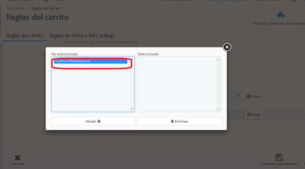 nadie Posted December 5, 2017 Share Posted December 5, 2017 43 minutes ago, Baldink said: Hola. Tenemos una consulta donde nos piden que haya gastos de envío gratis a partir de 60 euros en un pedido pero solo para los productos de un fabricante o proveedor específico. Hay alguna manera de hacerlo sin módulos de pago?? y si no, hay alguno disponible?? Esto sería mejor hacerlo sobre fabricantes o proveedores?? Gracias de antemano. Un saludo. Puedes usar los vales de descuento en Prestashop. Ejemplo en Prestashop 1.7 Nos vamos a la pestaña Catalogo -> Descuentos Nos vamos al bloque Reglas del Carrito Añadimos una nueva Por ejemplo mi regla se llama Regla de Nadie Adjunto Captura Ahora nos vamos a la pestaña "Condiciones" de la regla y en Restricciones seleccionamos "Selección de producto" y veremos que podemos filtrar el vale por proveedores o marcas Adjunto Captura Adjunto otra Captura Adjunto Captura 3 Una vez hayamos decidido los filtros, nos vamos a la pestaña "Acción" de la regla del carrito que estamos creando y señalamos "Envío gratuito" Adjunto Captura Link to comment Share on other sites More sharing options...