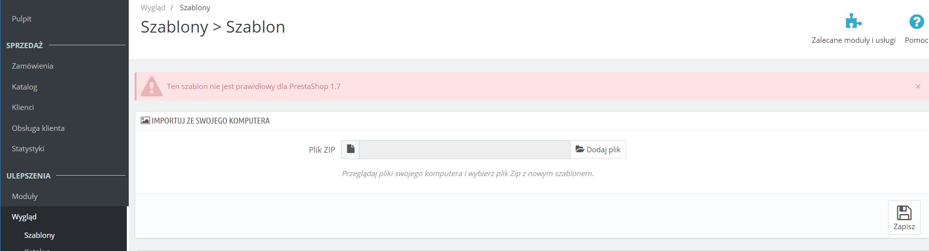 4.Próbuję zainstalować na serwerze szablon classic2.zip i otrzymuję błąd "Ten szablon nie jest prawidłowy dla PrestaShop 1.7".