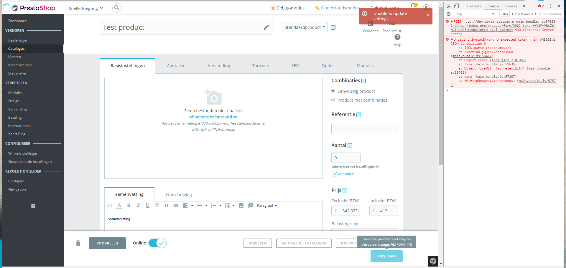 Innosons Posted December 9, 2017 Share Posted December 9, 2017 Beste forumleden, Als ik een product probeer op te slaan krijg ik de foutmelding "Unable to update settings" met een rode error rechtsboven, zie afbeelding in bijlage. Console zegt het volgende: Quote main.bundle.js:57623 POST /beheer/index.php/product/form/392?_token=HV9PyVNsZbjH2TdkAMjsOAbDsJqfc0-pVzi-hdRsmSY 500 (Internal Server Error) send @ main.bundle.js:57623 ajax @ main.bundle.js:57104 send @ form.js?1.7.0:858 (anonymous) @ form.js?1.7.0:1032 dispatch @ main.bundle.js:53185 elemData.handle @ main.bundle.js:52997 VM995:1 Uncaught SyntaxError: Unexpected token < in JSON at position 0 at JSON.parse (<anonymous>) at Function.jQuery.parseJSON (main.bundle.js:56412) at Object.error (form.js?1.7.0:909) at fire (main.bundle.js:51635) at Object.fireWith [as rejectWith] (main.bundle.js:51765) at done (main.bundle.js:57207) at XMLHttpRequest.<anonymous> (main.bundle.js:57571) Het importeren van al mijn producten van prestashop 1.6 naar prestashop 1.7 met Prestashop Storemanager is verder succesvol verlopen. Alleen deze bug nog. Kan iemand mij helpen?! Alvast bedankt! Link to comment Share on other sites More sharing options...