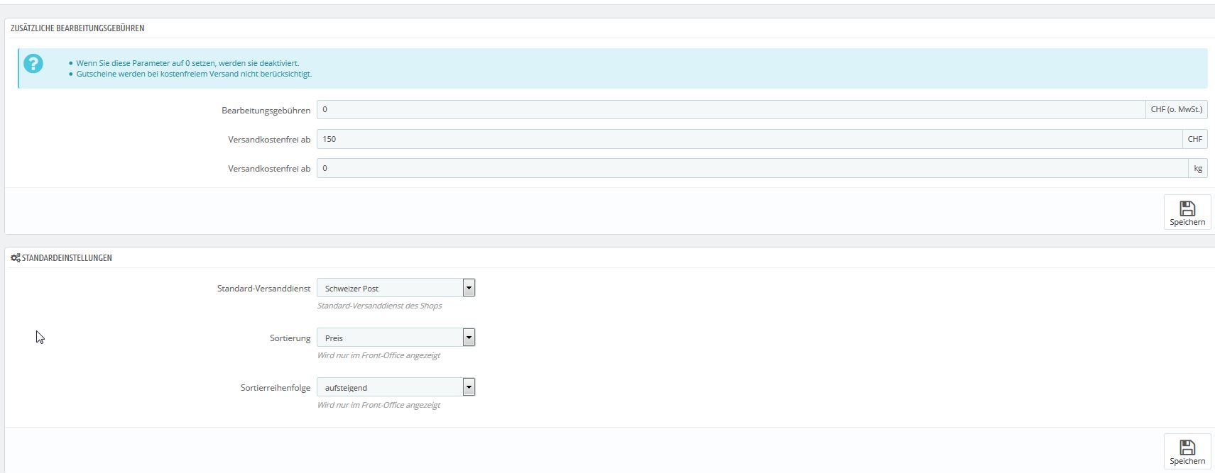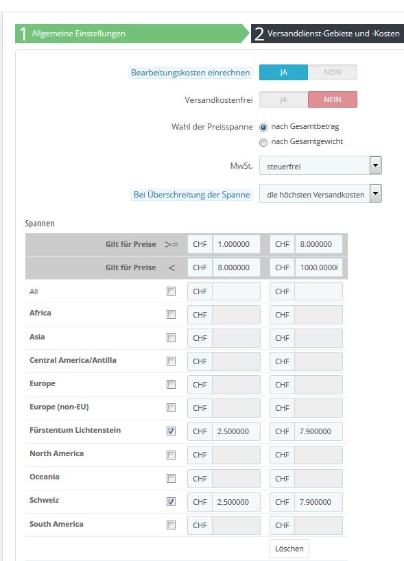vmax Posted December 11, 2017 Author Share Posted December 11, 2017 (edited) Also wenn Du diesen Ort meinst sind diese Einstellungen aktuell drinn. Siehe Screen Und wenn ich das richtig sehe ist eigentlich erst ab 150 CHf bzw, ab 10 Kg. Wobei ich das 10 Kg jetzt rausgenommen habe. Macht ja keinen Sinn. Und heute morgen habe ich mehrer Preisspannen bei den Versandkosten angelegt und gespeichert und dann plötzlich schwupps waren alle weg.. Wäre froh wenn Du mir weiter helfen kannst...Danke für Deine Bemühungen. Gruss, Thomas PS: Dieses Forum ist nicht gerade sehr aktiv....ist das immer so? Bin mir das anderes gewohnt... Was mir auffällt ist dass es in einer Kategorie perfekt funktioniert, aber in einer anderen eben gar nicht bzw, es sind 2 Unterkategorien. Bei der einen gehts, bei der anderen nicht. Gibt es da noch eine Idee? Grundsätzlich sind bei allen Produkten die gleichen Versandkosten/Versanddienste hinterlegt....ich dreh durch.... Edited December 11, 2017 by vmax (see edit history) Link to comment Share on other sites More sharing options...