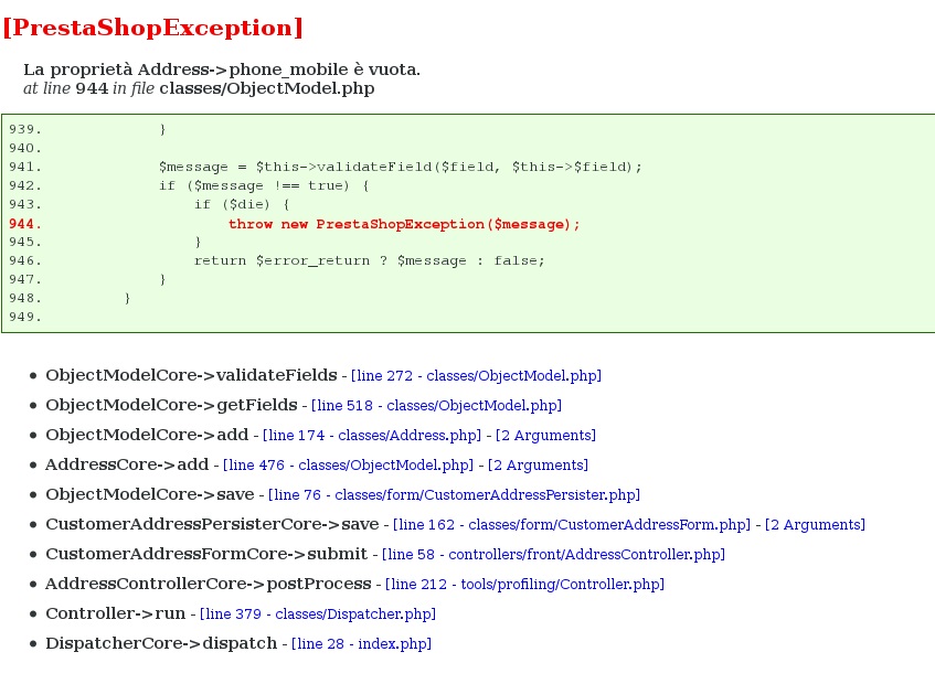 fiore Posted December 14, 2017 Author Share Posted December 14, 2017 Io ricordo che ho impostato il campo numero di telefono obbligatorio e forse è questo. Il mio servizio di hosting mi ha inviato questo debug dicendo che il problema è di prestashop. Link to comment Share on other sites More sharing options...