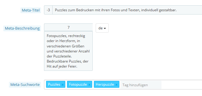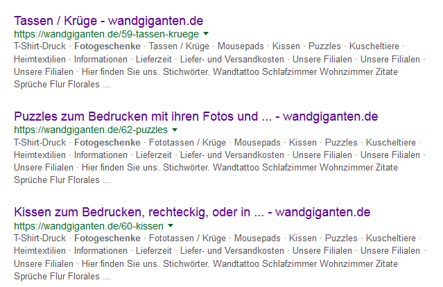 selectshop.at Posted December 30, 2017 Share Posted December 30, 2017 War der Shop schon mal mit einem anderen System online ? Bitte beachte auch dass Google die Meta-Titeln auf 70 Zeichen begrenzt und die Beschreibung auf 156 Zeichen (inkl. Leerzeichen). Wenn keine meta (Beschreibungen) vorhanden sind, dann holt er sich diese auch den Texten und Links von deiner Seite. Metas wurden nachträglich eingepflegt ? Für die Kategorie Tassen/Krüge sind die Metas so: Fototassen und Krüge, zum Gestalten und Bedrucken mit ihren Bildern. - wandgiganten.de Meta-Keywords: Fototassen,Tassen bedrucken,Bierkrug bedrucken Meta-Beschreibung: Fototassen zum Selbstgestalten und Bedrucken mit ihren eigenen Bildern und Texten Wir bieten höchste Qualität und brillanten Druck bei allen Tassen und Krügen Für die Kategorie Puzzles so: Titel: Puzzles zum Bedrucken mit ihren Fotos und Texten, individuell gestaltbar. - wandgiganten.de Meta-Keywords: Puzzles,Fotopuzzle,Herzpuzzle Meta-Beschreibung: Fotopuzzles, rechteckig oder in Herzform, in verschiedenen Größen und verschiedener Anzahl der Puzzleteile Bedruckbare Puzzles, der Hit auf jeder Feier Link to comment Share on other sites More sharing options...