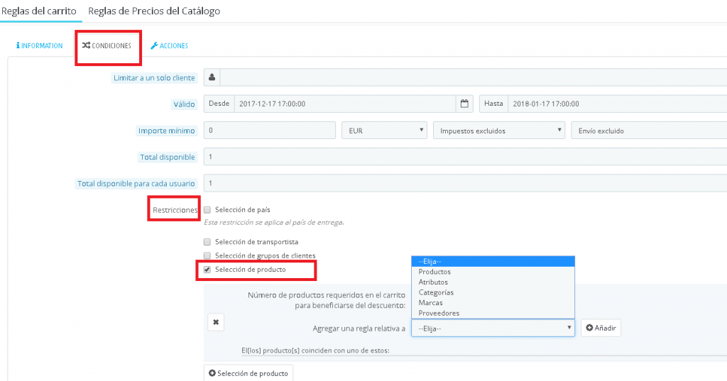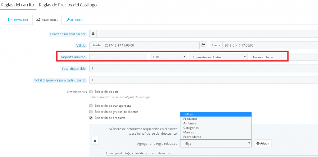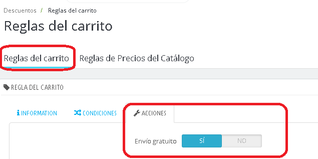nadie Posted December 17, 2017 Share Posted December 17, 2017 (edited) 29 minutes ago, lfelisiak said: Hola que tal gente de la comunidad, tengo una duda sobre realizar una modificacion sobre prestashop en una funcionalidad que necesito para mi tienda, Deseo hacer que si el total de los productos en el carrito suma mas de una determinada cantidad de dinero, y se tienen productos de determinadas categorias, este aplique un envio gratuito. Ahora bien, he llegado al punto en que no se donde debo realizar esta modificacion, tengo un modulo hecho donde configuro los productos y categorias y el precio de carrito para hacer el descuento, pero en donde puedo hacer que este codigo se ejecute? he probado en hookActionCartSave hookDisplayCarrierList pero no consigo cambiar el carrier, de hecho no encuentro una funcion (Leyendo el Cart.php) para cambiar el carrier. Alguien podria orientarme? Gracias de antemano. Hola, En principio no necesitas módulo u modificación de código para lo que planteas hacer en tu mensaje. Puedes crear una regla para que se aplique tal acción. Te pongo un ejemplo con varias imágenes. Vas a la pestaña Catalogo -> Descuentos, tal como puedes ver en esta imagen: http://victor-rodenas.com/wp-content/uploads/2017/12/edea.png Ahora en "Reglas del Carrito" -> Añade una nueva, tal como puedes ver en esta imagen: http://victor-rodenas.com/wp-content/uploads/2017/12/anadirReglaCarrito-1024x385.png Y dentro de la pestaña "Condición" tienes una opción llamada "Selección de Producto", tal como puedes ver en esta imagen: http://victor-rodenas.com/wp-content/uploads/2017/12/restricionProductos-1024x537.png donde puedes restringir la aplicación de la regla que estas creando. Además en condición puedes establecer un pedido mínimo para la aplicación, tal como puedes ver en esta imagen: http://victor-rodenas.com/wp-content/uploads/2017/12/importe_minimo-1024x506.png Una vez configurado lo comentado en el párrafo anterior, si vas a la pestaña "Acciones" puedes seleccionar "Gastos de envío gratis", tal como puedes ver en esta imagen: http://victor-rodenas.com/wp-content/uploads/2017/12/Gratis.png Edited December 17, 2017 by nadie (see edit history) Link to comment Share on other sites More sharing options...