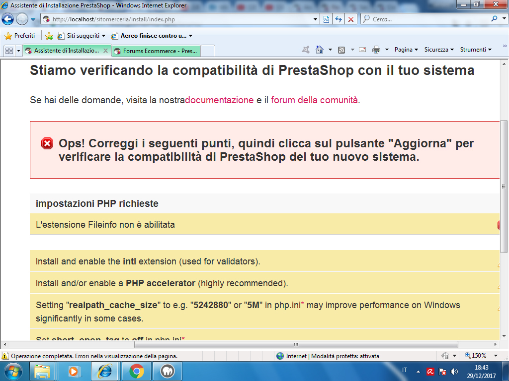 StefanoDiRomualdo Posted December 29, 2017 Share Posted December 29, 2017 Salve a tutti, in fase di installazione mi compare questo messaggio che sembrerebbe legato alla compatibilità di Windows. E' risolvibile? L'estensione Fileinfo non è abilitata Poi ci sono tutti questi altri messaggi ma non vorrei abusare della vostra disponibilità. Mi auguro solo che almeno siano raccomandazioni facoltative. Install and enable the intl extension (used for validators). Install and/or enable a PHP accelerator (highly recommended). Setting "realpath_cache_size" to e.g. "5242880" or "5M" in php.ini* may improve performance on Windows significantly in some cases. Set short_open_tag to off in php.ini*. Grazie in anticipo Link to comment Share on other sites More sharing options...