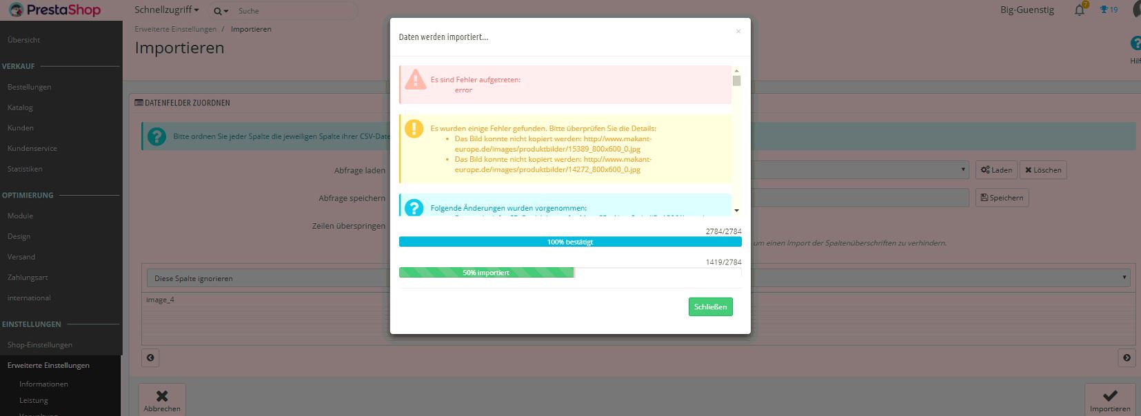 megaguenstig Posted January 1, 2018 Share Posted January 1, 2018 hallo zusammen ich habe immer wieder komische fehlern beim csv import, bei 50% hat er jetzt gestoppt mit dem fehler das er ein bild nicht kopieren konnte. Aber das Bild liegt auf dem server wenn ich es mit dem link suche kommt es auch im Browser. An was liegt das? Siehe Bild Meine Version: 1.7.2.4 Hosting von hostinger.de Link to comment Share on other sites More sharing options...