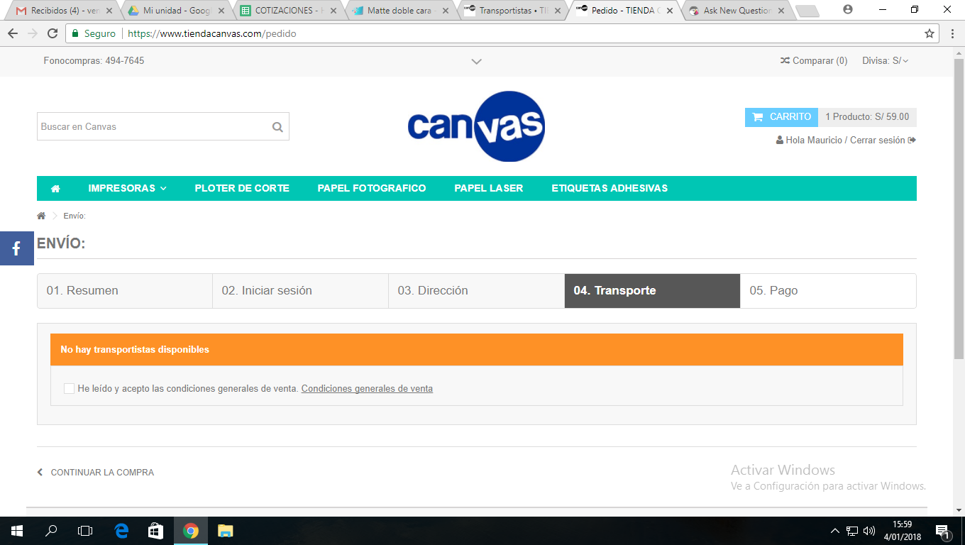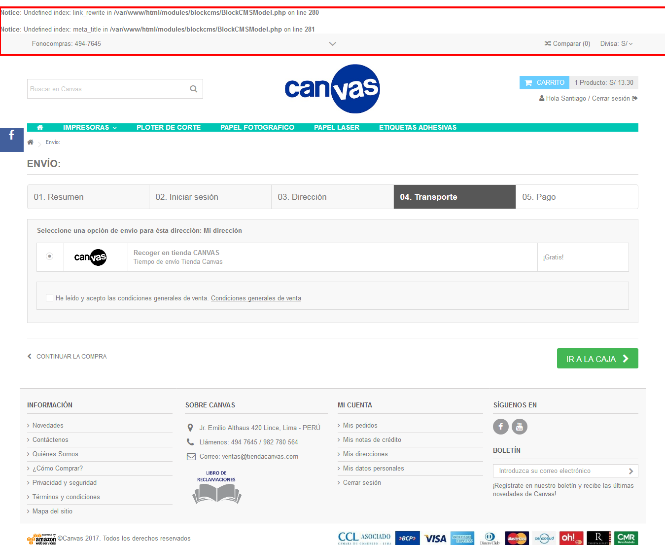 TiendaCanvas Posted January 4, 2018 Share Posted January 4, 2018 Hola Buen día, quiero consultar como puedo configurar el error que me bota de que no hay transportistas disponibles, el caso es que solo pasa con un grupo de productos que se selecciona para la compra, con otros el proceso de compra es normal y no hay problemas. Mi pagina web es: www.tiendacanvas.com Como les indico cuando selecciono un producto que es un accesorio del ploter de corte, no me deja terminar el proceso de compra por que me indica que no hay transportista. Adjunto la captura de pantalla. Espero me puedan dar unos consejos para solucionar este pequeño problema. Gracias, Saludos Link to comment Share on other sites More sharing options...