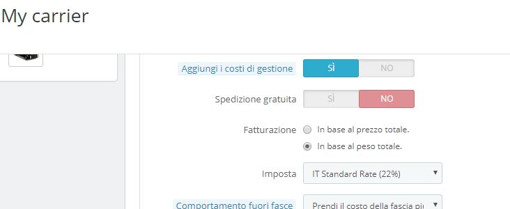 oraziodevita Posted January 13, 2018 Author Share Posted January 13, 2018 On 8/1/2018 at 11:17 AM, developer prestashop said: OK. forse è un problema del template caricato. Controlla il file shopping-cart presente nella cartella del template. Queste le righe, del template standard Prestashop, che si occupano della visualizzazione delle spese di spedizione con o senza Iva. Confrontale o prova a verificare quale riga/sezione viene richiamata dal tuo template. {if $use_taxes && $total_shipping_tax_exc != $total_shipping} {if $priceDisplay} <tr class="cart_total_delivery{if $total_shipping_tax_exc <= 0} unvisible{/if}"> <td colspan="{$col_span_subtotal}" class="text-right">{if $display_tax_label}{l s='Total shipping (tax excl.)'}{else}{l s='Total shipping'}{/if}</td> <td colspan="2" class="price" id="total_shipping">{displayPrice price=$total_shipping_tax_exc}</td> </tr> {else} <tr class="cart_total_delivery{if $total_shipping <= 0} unvisible{/if}"> <td colspan="{$col_span_subtotal}" class="text-right">{if $display_tax_label}{l s='Total shipping (tax incl.)'}{else}{l s='Total shipping'}{/if}</td> <td colspan="2" class="price" id="total_shipping" >{displayPrice price=$total_shipping}</td> </tr> {/if} {else} Ciao, ho controllato ed il codice che mi hai dato corrisponde a quello del mio shopping-cart. On 11/1/2018 at 10:42 AM, Fabry said: Salve, Il problema probabilmente é nella configurazione del modulo Conformitá UE avanzata; lá dentro trovi ( devi entrare nella configurazione del modulo nel BO) la spunta per mostrare il label delle tasse nelle spedizioni e nei prezzi. Facci sapere. Ciao Ciao, grazie per la risposta. Non credo di aver capito a quale modulo ti riferisci. Non sono riuscito a trovare "Conformità UE" da nessuna parte. Link to comment Share on other sites More sharing options...