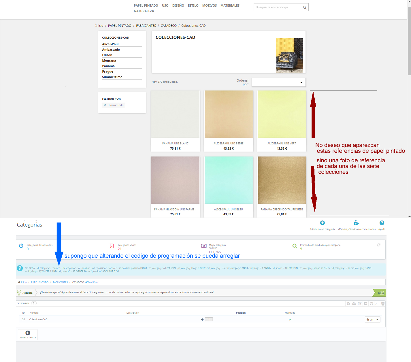 Rosa María del Río Posted January 7, 2018 Share Posted January 7, 2018 Hola a todos: quisiera que alguien pudiera indicarme como tengo que hacer para que solucionar el contenido de varias pestañas de mi menú. Se trata de que los productos de mi tienda aparecen en todas y cada una de las pestañas del menú 21 producto, y en general es así, porque lo indique en configuración de productos, pero hay tres pestañas (Papeles Pintados-Fabricantes y Colecciones), en las que no deseo que aparezcan , sino solamente quiero una presentación con textos y unas imágenes que se correspondan con la pestaña en cuestión, nada más. Es decir el resto hacia debajo de esas tres pestañas en blanco, sin ningún producto. He reflexionado sobre el asunto y veo al ir a “Categorias” y seleccionar una de estas tres categorias, viene una ventanita a la derecha que pone "Mostrar consulta SQL" y pienso que es ahí ,donde debo de modificar el código y luego "Exportar a SQL Manager", pero no me atrevo pues desconozco como y que cambiar. El código es este SELECT a.`id_category`, `name`, `description`, sa.`position` AS `position`, `active` , sa.position position FROM `ps_category` a LEFT JOIN `ps_category_lang` b ON (b.`id_category` = a.`id_category` AND b.`id_lang` = 1 AND b.`id_shop` = 1) LEFT JOIN `ps_category_shop` sa ON (a.`id_category` = sa.`id_category` AND sa.id_shop = 1) WHERE 1 AND `id_parent` = 43 ORDER BY sa.`position` ASC LIMIT 0, 50 Adjunto una imagen explicativa del problema, por si pudieran ayudarme. Muchas gracias de antemano. Link to comment Share on other sites More sharing options...