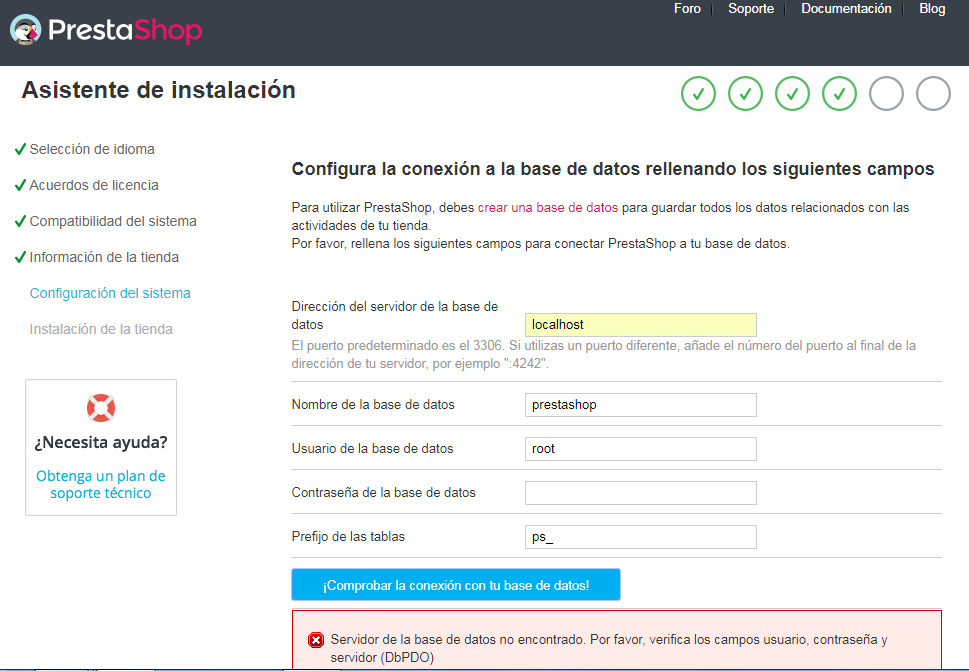 sonystation Posted January 8, 2018 Share Posted January 8, 2018 Buenos Tardes, estoy intentando instalar prestashop en mi equipo local, he utilizado MAMP para windows pero en el paso que configuras la conexión con la base de datos me da el siguiente error y no puede continuar: Servidor de la base de datos no encontrado. Por favor, verifica los campos usuario, contraseña y servidor (DbPDO) ¿Que puede estar pasando? Link to comment Share on other sites More sharing options...