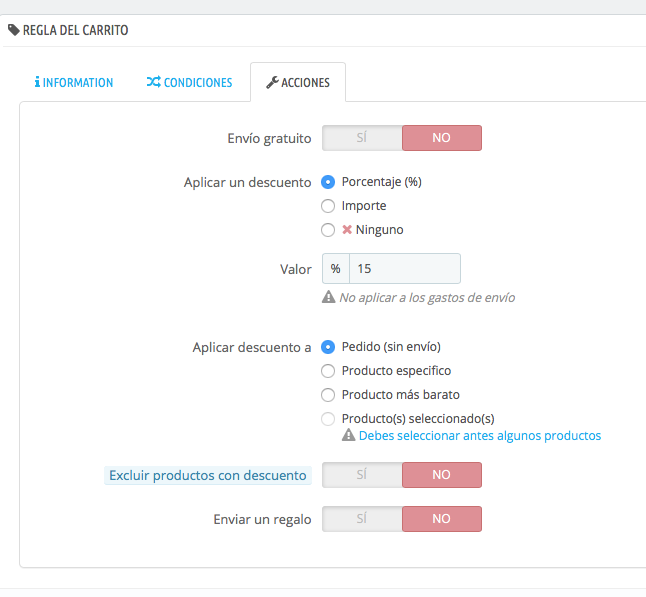AnaLOL Posted January 13, 2018 Share Posted January 13, 2018 (edited) Hola En Reglas del carrito---> Acciones hay un botón para "Excluir productos con descuento". Esto al menos en PS 1.7, ¿no está en tu versión?, (Adjunto captura) Saludos Edited January 13, 2018 by AnaClub (see edit history) Link to comment Share on other sites More sharing options...