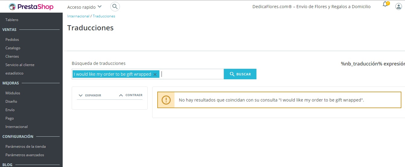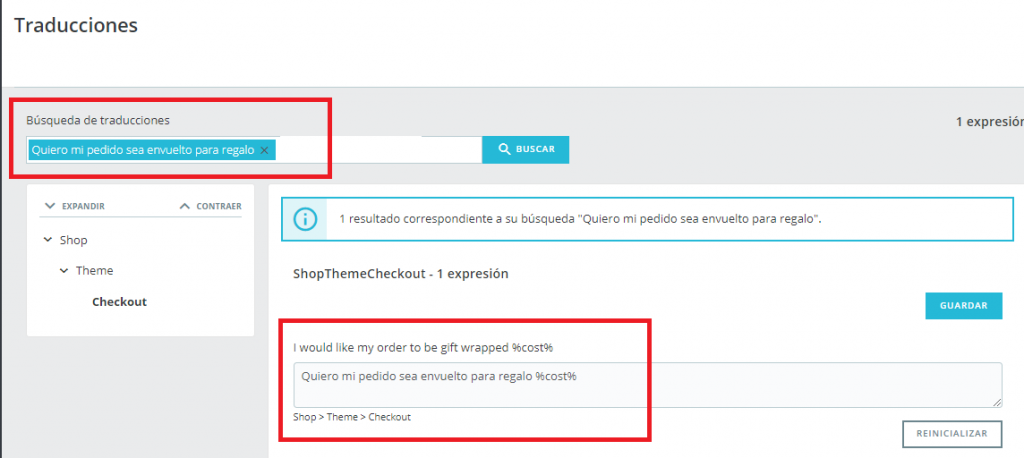 nadie Posted January 19, 2018 Share Posted January 19, 2018 (edited) En Prestashop 1.7, en el panel de tu tienda, si te diriges a la Pestaña Internacional -> Traducciones -> Bloque Modificar Traducciones Tipo de traducción -> Traducción de temas Seleccione tu tema -> La platilla que estés usando en tu tienda. Seleccione su idioma -> Español si quieres cambiar la palabra/frase en el idioma Español. Una vez usted haya pulsado en modificar, y entrado al panel de traducciones, escribe en el buscador la frase: "Quiero mi pedido sea envuelto para regalo" y le aparecerá para cambiar la palabra. Adjunto Captura -> http://victor-rodenas.com/wp-content/uploads/2018/01/CambiarFraseEnvueltoRegalo-1024x458.png Guía gráfica aquí: http://victor-rodenas.com/cambiar-texto-envolver-regalo-en-prestashop-1-7 Saludos, Edited January 19, 2018 by nadie (see edit history) Link to comment Share on other sites More sharing options...