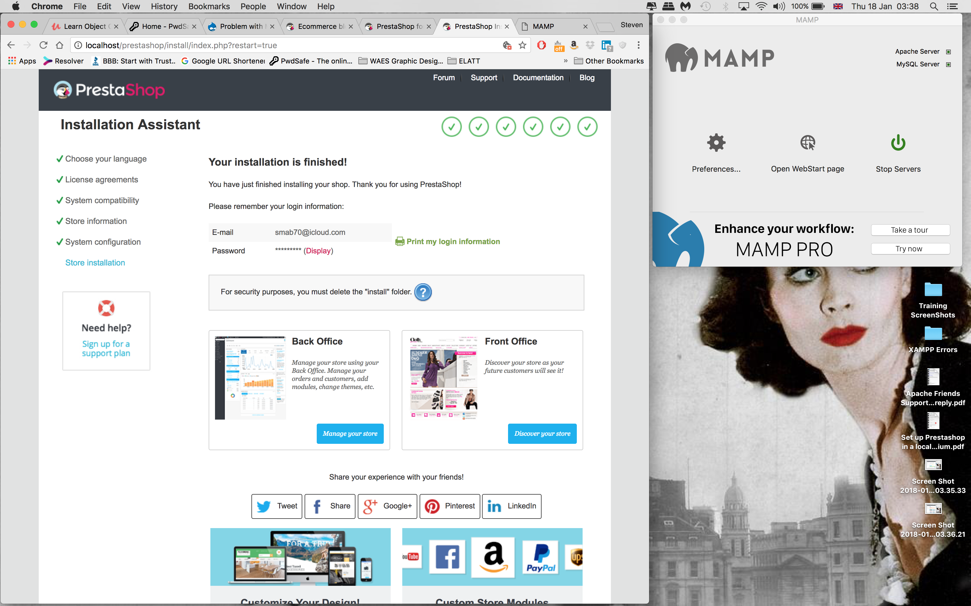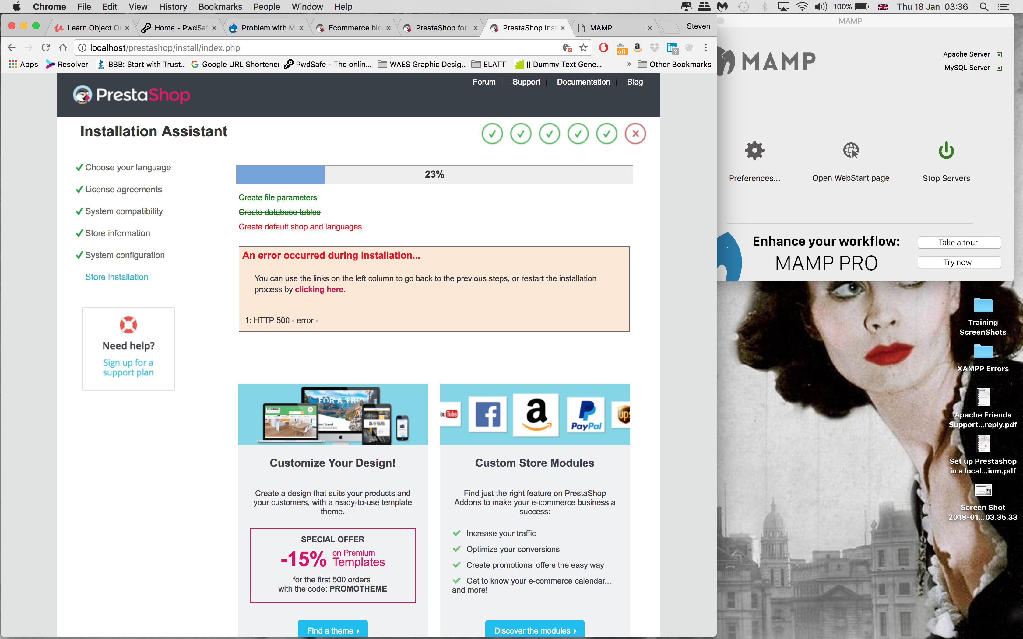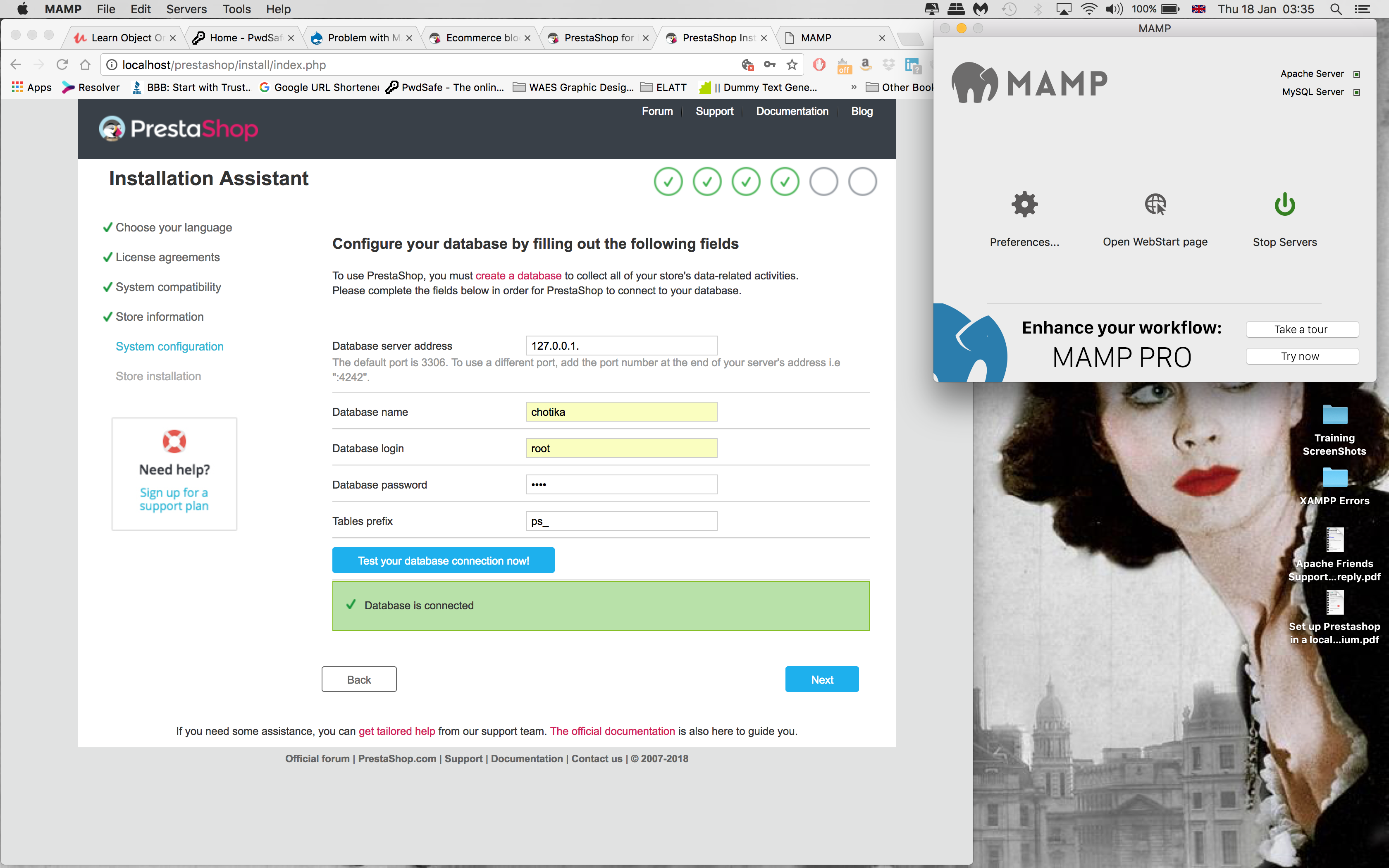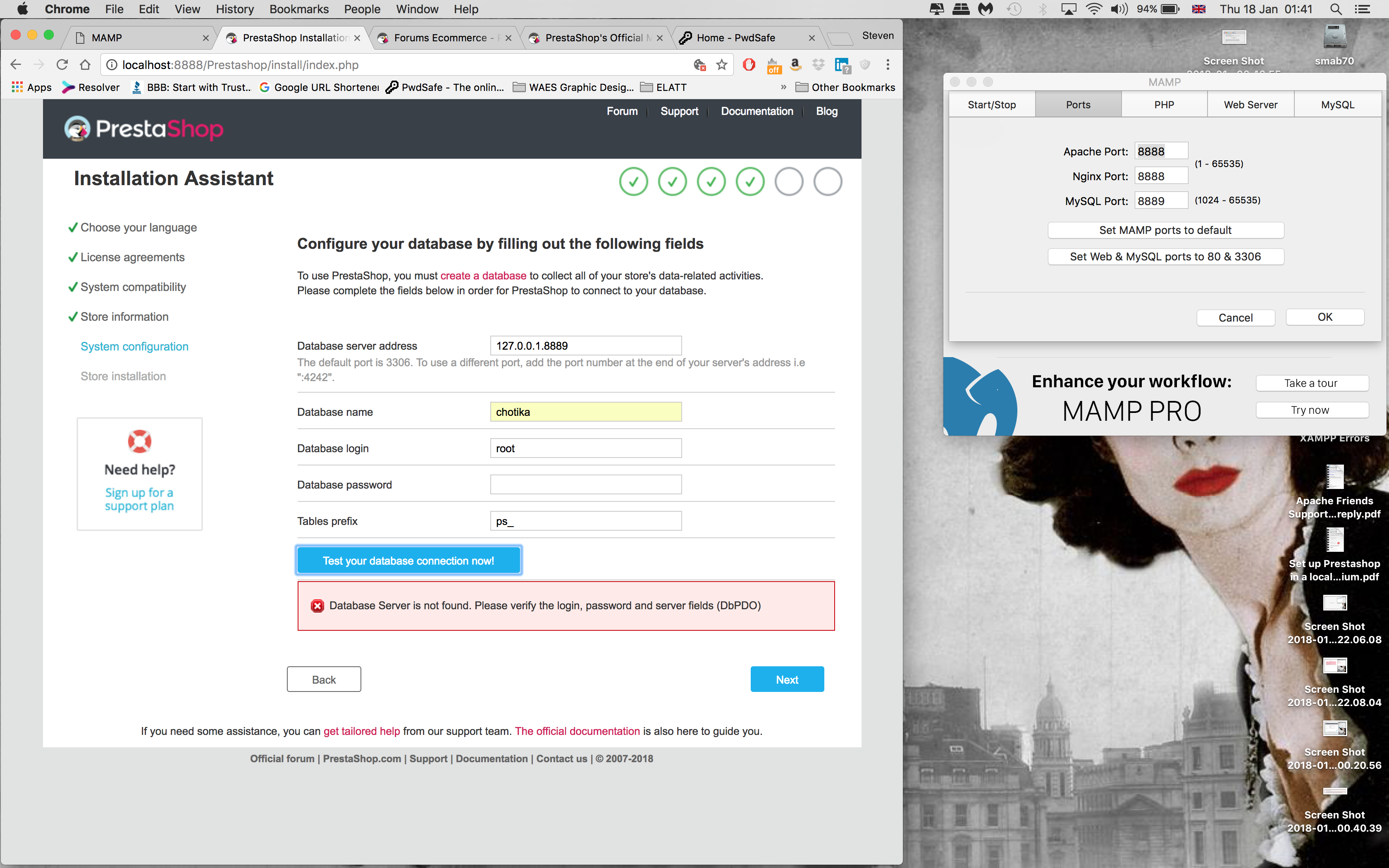 smab Posted January 18, 2018 Share Posted January 18, 2018 I'm a newbie to Prestashop trying to install it following "PRECISE" documentation and apart from major disasters via XAMPP (I gave up on Bitnami and Apache Friends and their forums and lack of support or help) and ended up using MAMP this is now the furthest I have got in 8 days YES 8 DAYS so much for 5-10min install. I am using a 13"MBPr (mid 2014) MacOSX 10.12.6 MAMP 4.2.1 And "TRYING" to install your latest version of Prestashop 1.7.2.4 On the test your database section, the installation becomes stuck.Database Server is not found. Please verify the login, password and server fields (DbPDO)I'm a student trying to evaluate the software for a course credit. I had initially 2 weeks to do it in, which now has took 8 days to get this far. I was also suppossed to do it with XAMPP according to the brief but that was why 8 days later I'm here with MAMP. GREAT SOFTWARE AND HELP PRESTASHOP! seems no direct instructions for Mac users not even on youtube.This is my last ditch with this now, if i don't get a reply from anyone soon I seriously will just pack up and leave and report my experiences to whoever will listen and make sure I find an alternative way to do things other than ever use this software again. Link to comment Share on other sites More sharing options...
