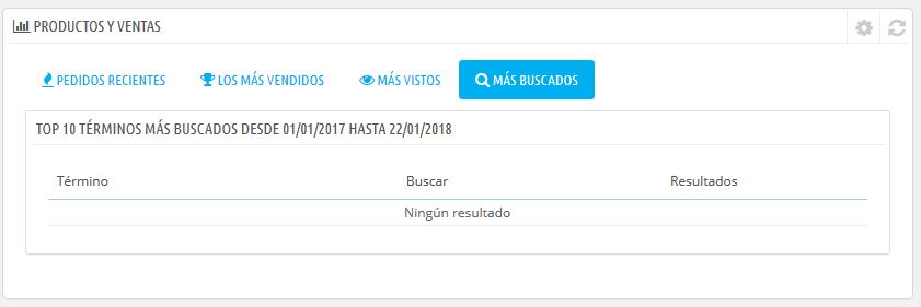 Últimamente me he dado cuenta que en el módulo de panel del Dashboard "Productos y Ventas" las listas de "Más vistos" y "Más buscados" aparecen vacías.