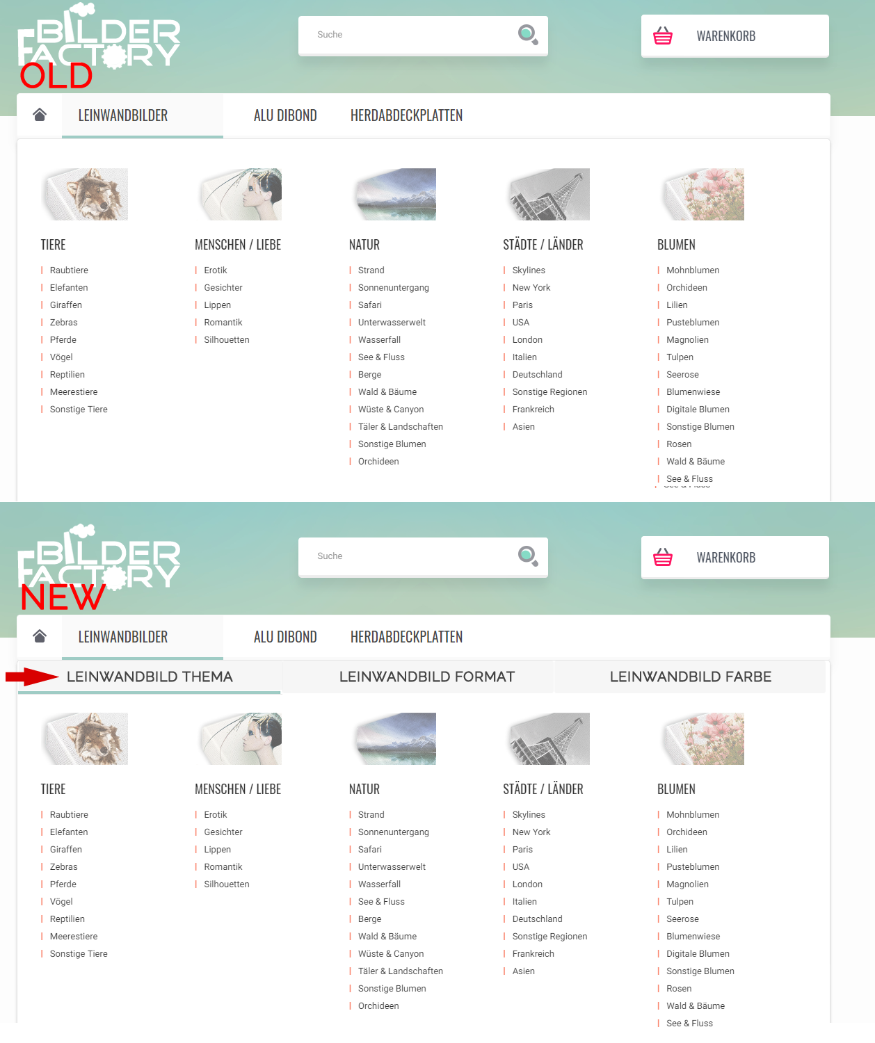 Schlee Posted January 24, 2018 Share Posted January 24, 2018 (edited) Hi all, I am actually working on my new Webshop: www.bilder-factory,ch Probably you can take a look at the Menu Navigation. For this kind of Business it is important to work with thumbnails from the very first moment in the menu navigation as this is a visual business and the customer can get fast an idea what he looks for. Soooo, as I am getting more main categories I have to put some categeories together so, there would be a three layered Navigation. As example: - PAINTINGS --- PAINTINGS SIZE --- PAINTINGS COLOR --- PAINTINGS TOPIC To understand better I have put a BEFORE/AFTER Picture. The NEW I did prepare with Photoshop... With which module can I reach this result or get close to this result? Is there anyone I can hire here? Many thanks Beep Edited January 24, 2018 by Schlee (see edit history) Link to comment Share on other sites More sharing options...