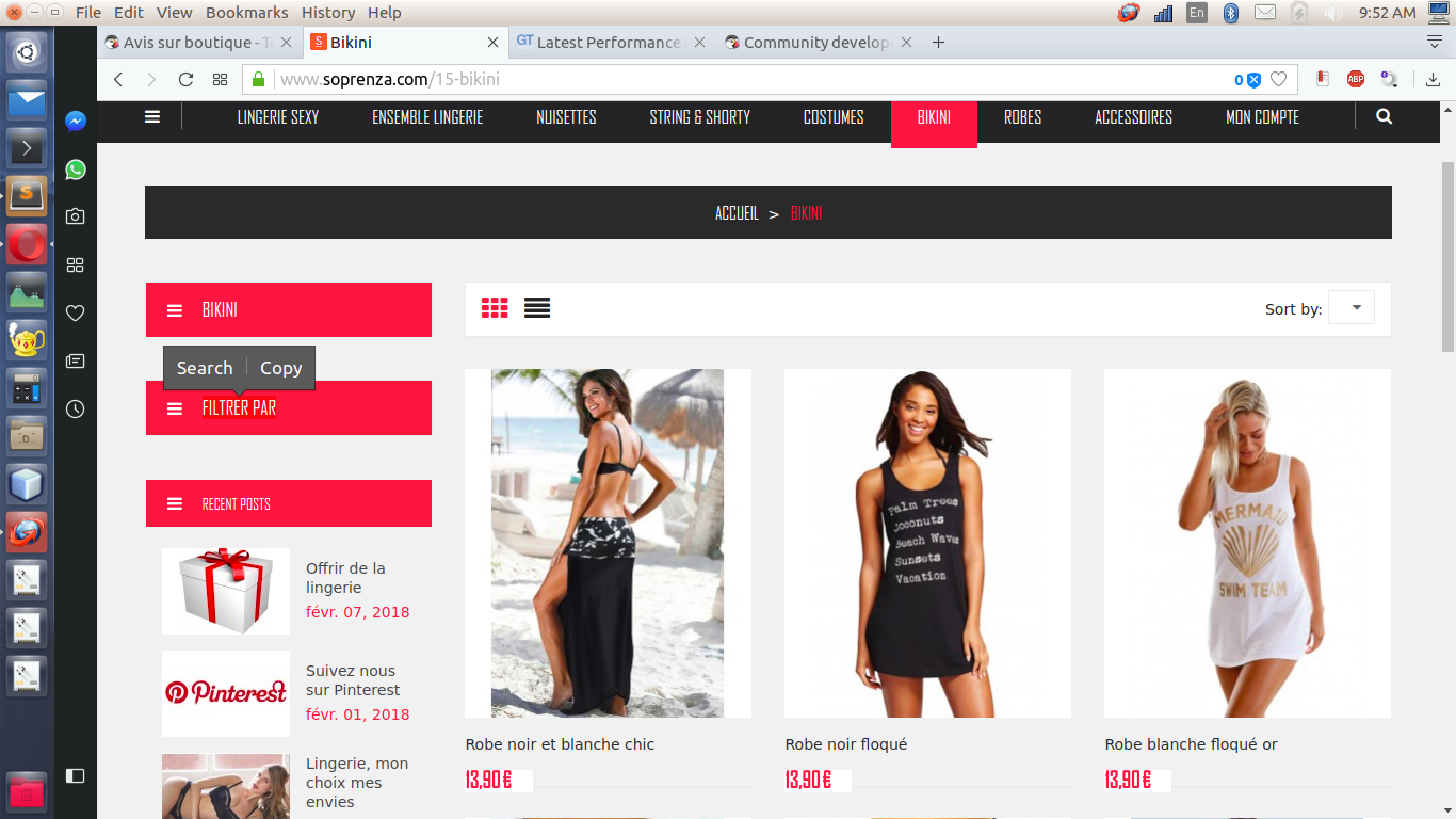 Zohaib-fk Posted February 26, 2018 Share Posted February 26, 2018 (edited) Bonjour, Congragulation pour votre boutique en ligne. J'ai des commentaires concernant les points ci-dessous. [1]. L'année doit être mise à jour en pied de page Par exemple © 2017-2018 Soprenza.com [2] La vitesse a besoin d'améliorations, les images doivent être optimisées et d'autres mises à jour selon les suggestions de Gtmetrix [3]. J'aime les looks et le design du site. [4]. Je ne vois aucune option dans la page de catégorie pour filtrer par. Joindre des captures d'écran concernant les points ci-dessus. J'espère que mes suggestions aideront. PrestaShop Tutorials Videos [How to do Tasks] https://www.prestashop.com/forums/topic/907438-prestashop-tutorials-videos-how-to-do-tasks/ Edited July 1, 2021 by Zohaib-fk Post Updated (see edit history) Link to comment Share on other sites More sharing options...