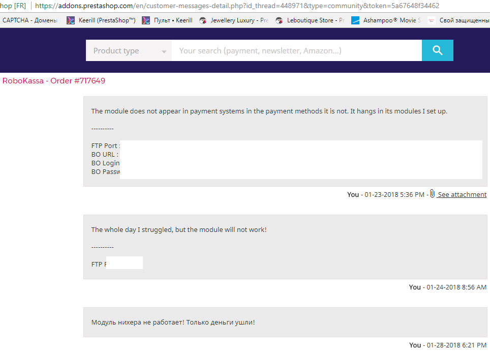 Ayrat Afzalutdinov Posted January 28, 2018 Share Posted January 28, 2018 (edited) I bought a module of Robocassa, it is not a working one. The developer does not respond. What to do? Edited January 28, 2018 by Ayrat Afzalutdinov (see edit history) Link to comment Share on other sites More sharing options...