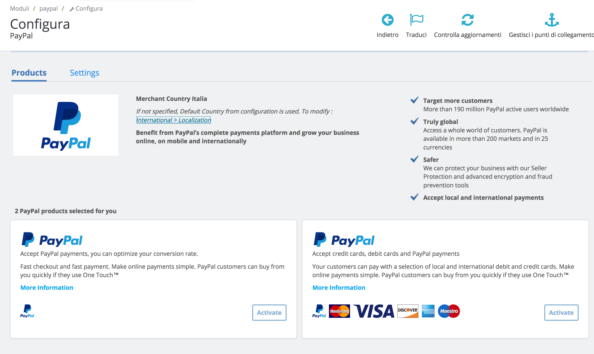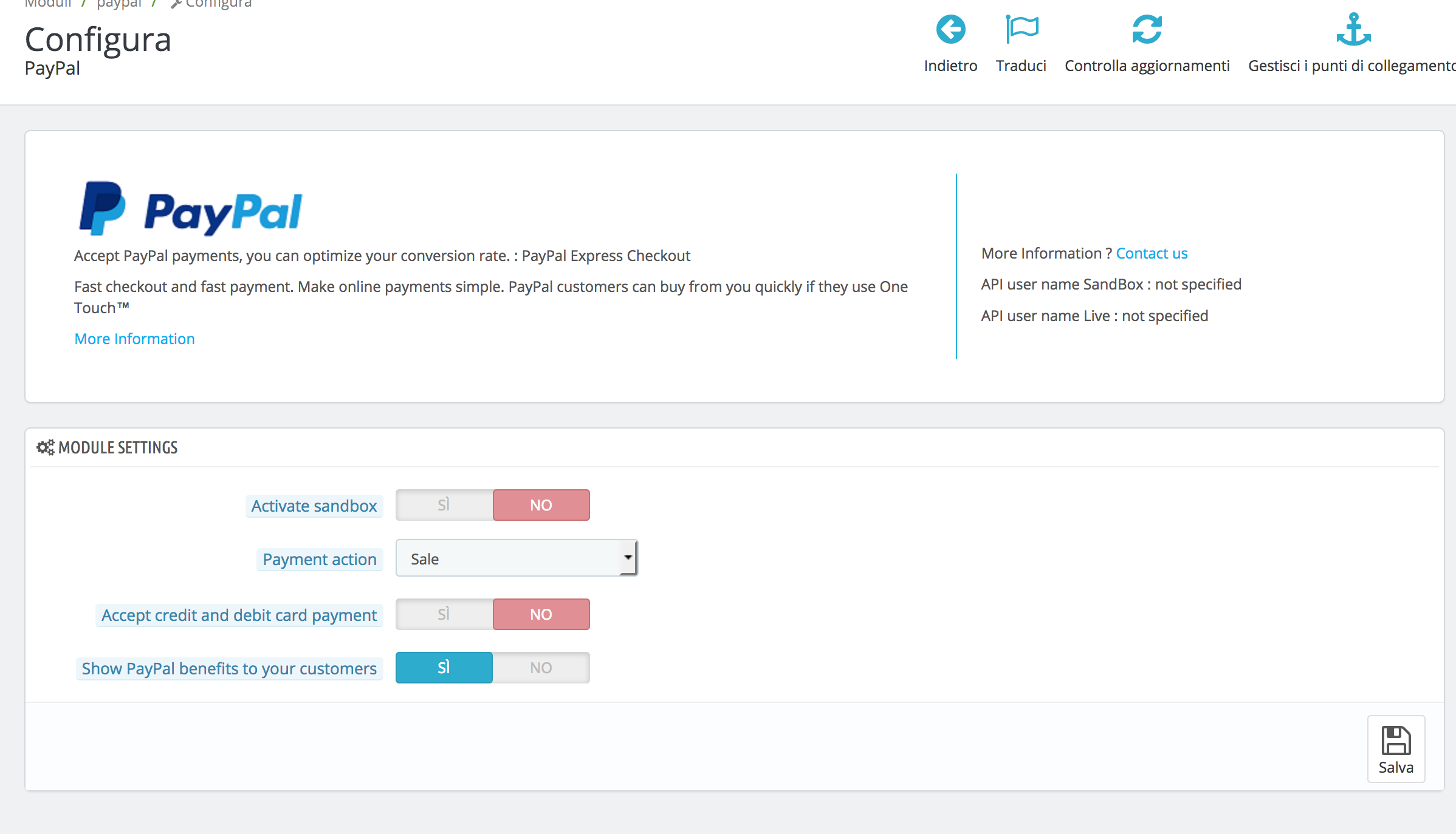 Silviotrisorio Posted January 29, 2018 Share Posted January 29, 2018 (edited) Ciao, ho istallato attivato il modulo nativo per i pagamenti con paypal, il problema e che non vedo i campi per inserire le credenziali di un conto paypal già attivo, se clicco su Activate mi chiede sempre di crearne uno nuovo...Dove sbaglio? Allego screenshot dell due scrermate. Grazie in anticipo. Edited January 29, 2018 by Silviotrisorio (see edit history) Link to comment Share on other sites More sharing options...