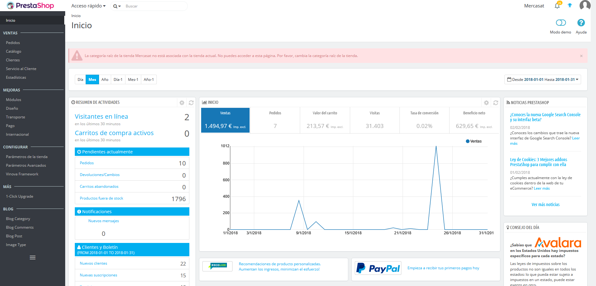 jorge Posted February 5, 2018 Share Posted February 5, 2018 (edited) Hola buenas, cuando voy a entrar en la pagina de Categorías, me salta este error: La categoría raíz de la tienda "Mercasat" no está asociada con la tienda actual. No puedes acceder a esta página. Por favor, cambia la categoría raíz de la tienda. Y no se como cambiar la categoria raiz de la tienda, ya que no puedo acceder a la pagina de categorias. Adjunto pantallazo cuando entro en la pagina de "categorias". Version de Prestashop: 1.7.2.4 Si alguien me puede ayudar a solucionar el problema. Saludos y gracias. Edited February 5, 2018 by jorge mas detalles (see edit history) Link to comment Share on other sites More sharing options...