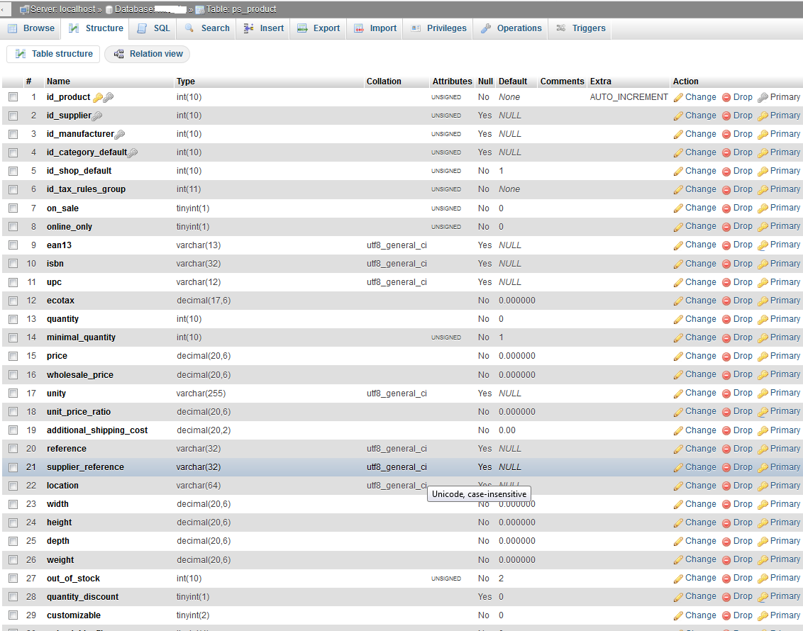 Bousquet777 Posted February 18, 2018 Author Share Posted February 18, 2018 (edited) OK und danke. Hier ein Screen der Struktur der Tabelle ps_product. Version Presta 1.7.2.4 Beste Grüsse Edited February 18, 2018 by Bousquet777 Tippfehler (see edit history) Link to comment Share on other sites More sharing options...