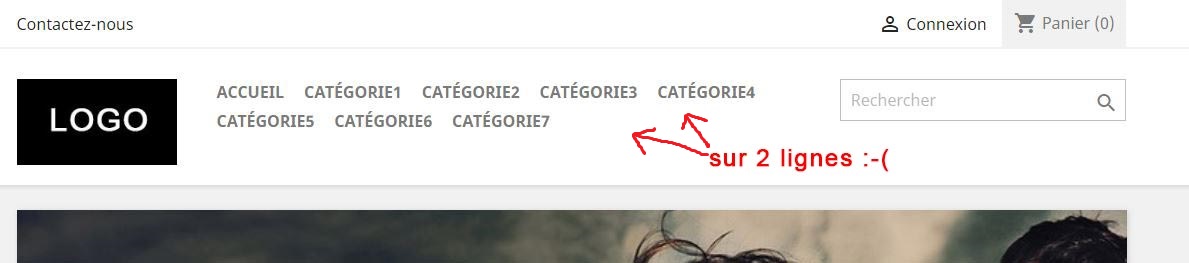 Je souhaiterai modifier le header (logo, menu, barre de recherche) de telle sorte que le menu horizontal tienne sur une ligne et non deux. En effet, dès qu’il y a trop de catégories le menu se met sur deux lignes.