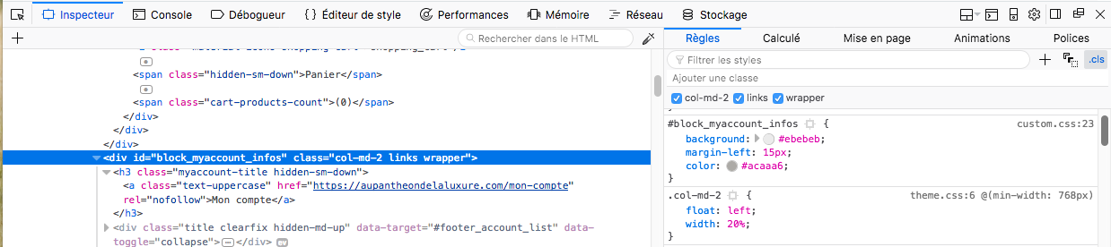 jai réussi a rajouter des lignes de code dans le custom.css concernant mon compte mais , un nouveau probleme se présente dans le footer, un encadrer apparait aussi. Je dois créer une ligne de commande concernant le footer?.
