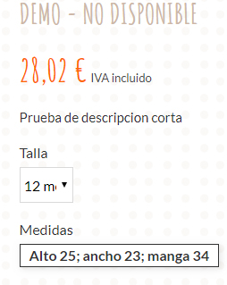 Jorge Posted March 12, 2018 Author Share Posted March 12, 2018 Bueno, pues ya he encontrado un solución más o menos aceptable. Tengo una serie de tallas para cada producto y quiero que en la descripción para cada talla salgan las medidas concretas de dicha talla. Para ello creo un nuevo atributo llamado MEDIDAS y lo hago de tipo "radio". Luego en el CSV de las combinaciones incluyo ambos atributos. En realidad no se generan más combinaciones porque cada talla tiene una única correspondencia de medidas, así a la talla XS le corresponde la medida 20, a la S la medida 22... Finalmente sólo falta modificar con CSS el formato estético, haciendo desaparecer el icono del radio button, bordes etc al gusto Link to comment Share on other sites More sharing options...