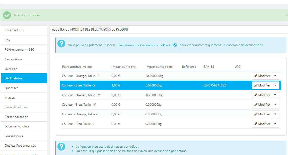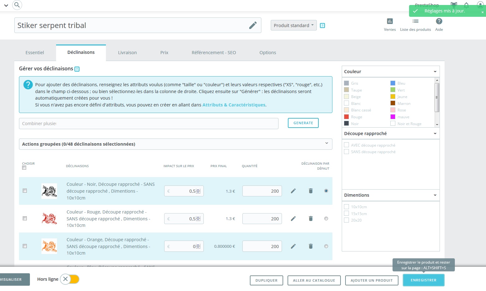 Lytazo Posted February 17, 2018 Author Share Posted February 17, 2018 Version de PrestaShop : 1.7.1.2 (ce que j'ai en information sur le panel admin de mon prestashop je te met l'image que j'ai quand j'enregistre ont voit bien en haut à droite le cadre disant réglages mis à jour mais si je continue de changer les autres déclinaisons que je vais sur d'autres produits etc et que j'ai besoin de revenir les prix changeront tout seuls entre temps Link to comment Share on other sites More sharing options...