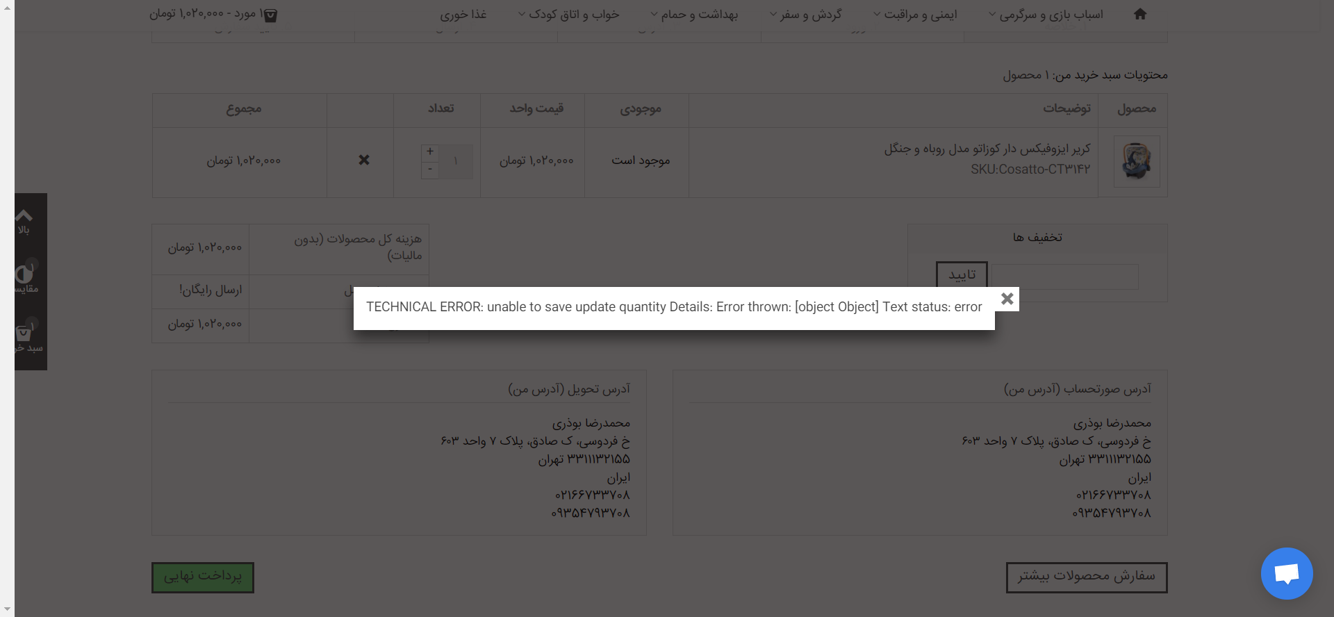 boozary Posted February 18, 2018 Share Posted February 18, 2018 (edited) Hi, I am using Prestashop 1.6.1.17 I get this error : "TECHNICAL ERROR: unable to save update quantity Details: Error thrown: [object Object] Text status: error" In the following senarios: - When I have one product in my shopping cart and I remove it and there are no other products in my shopping cart - When I have two different products (one of each) in my shopping cart and I remove one of them When I remove WWW from Koodak.City in admin settings it wroks fine! But when I copy Koodak.City to another host the problem remains with or without WWW !! I even removed the Panda theme and all settings I have done but the problem remain even with the default theme In all when I remove a Product from shopping cart and that product's quantity changes to zero I get this error How can I fix this problem? Edited February 18, 2018 by boozary (see edit history) Link to comment Share on other sites More sharing options...