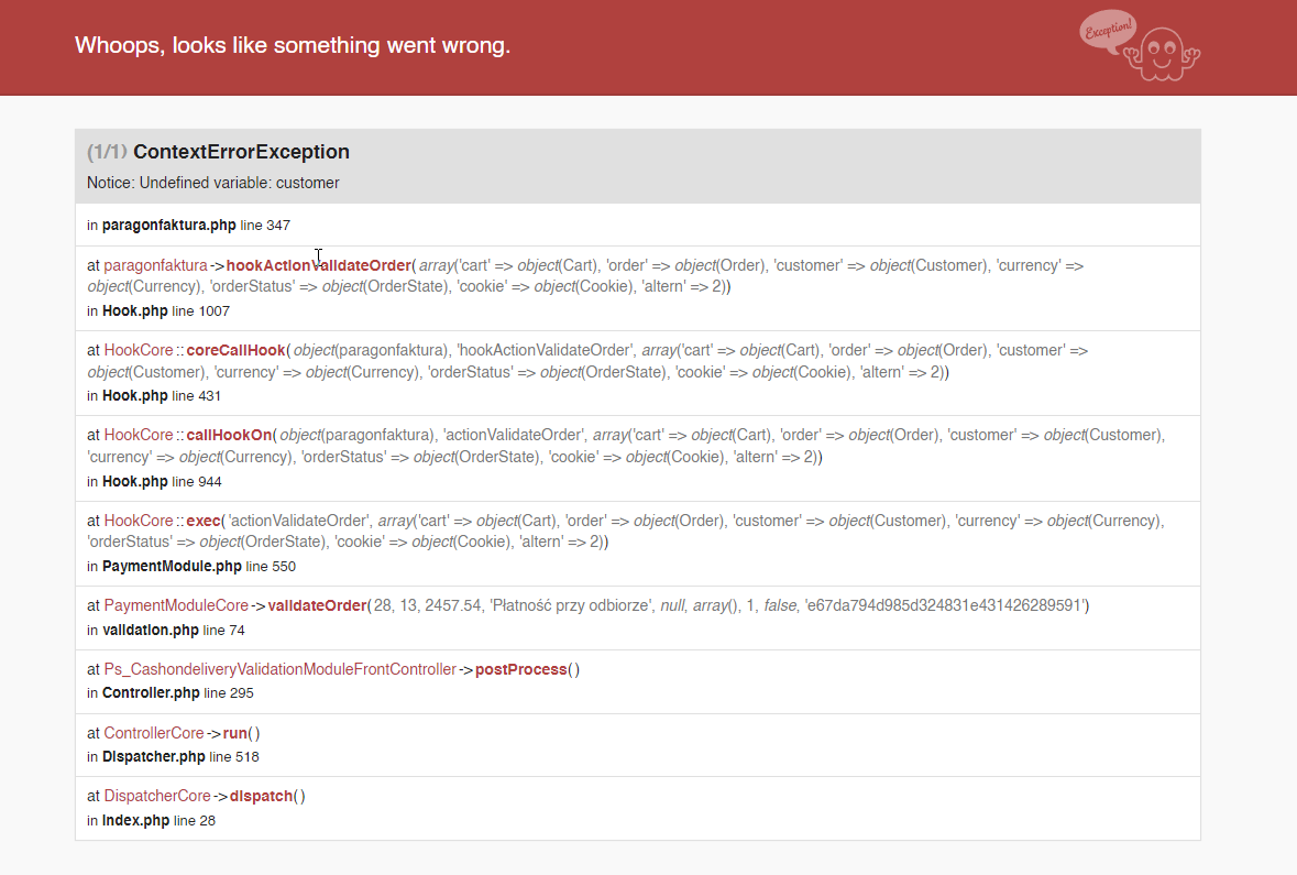 Chrisu Posted December 15, 2022 Share Posted December 15, 2022 (edited) Cześć, u mnie przy realizacji zamówienia pojawia się błąd ContextErrorException Notice: Undefined variable: customer. Bez różnicy, który typ dokumentu jest domyślny / wybrany. Wersja modułu dla 1.7.7 - Wersja Presty 1.7.8.7. Jakieś pomysły, co to może być? @cypispga @cypispga Edited December 15, 2022 by Chrisu (see edit history) Link to comment Share on other sites More sharing options...