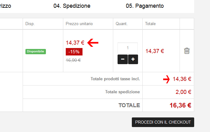curcio Posted February 22, 2018 Share Posted February 22, 2018 Salve ho un problema visibile nell'iimagine in allegato: vi è una discordanza di pochi centesimi tra il prezzo unitario del prodotto e il prezzo totale tasse incluse del carrello. Come mai? Ecco come ho configurato il sito: su regole carrello prezzo ho creato uno sconto del 15% su tutti i 2 tipi di gruppi utenti, visitatori e registrati, quindi il calcolo -15% viene fatto in automatico. Attendo info grazie Link to comment Share on other sites More sharing options...