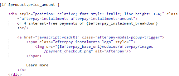 ClassicalEquitation Posted February 25, 2018 Share Posted February 25, 2018 Hi I had Afterpay installed onto my Prestashop and the layout of the price has been altered. I spoke to Afterpay but aside from giving what page I need to fix they couldnt/wouldnt give me the solution. The test saying how many payments ext is sitting on top of the price and looks really bad. I would like that entire Afterpay block to sit below the price not beside it. I have attached a screen shot of what it looks like and also the code in the page they say I need to change. Can someone help me please. Johanna Link to comment Share on other sites More sharing options...