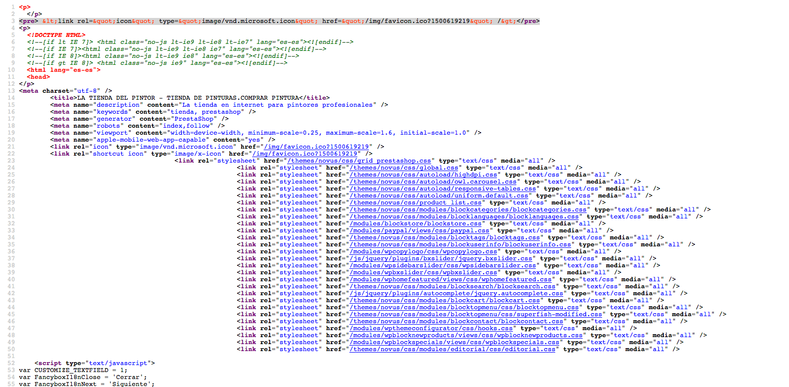 El pantallazo que te he enviado es el que me sale si miro el codigo en el navegador.Es decir, pongo www.latiendadelpintor.org en el navegador,voy a herramientas>desarrolador web> ver codigo fuente de la pagina.
