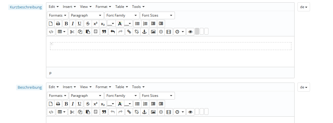 eleazar Posted February 28, 2018 Share Posted February 28, 2018 Word solltest du dir wirklich abschminken, wenn du nicht aus Versehen irgendwelche verborgenen Formatierungen mitübernehmen möchtest. Man kann den Editor übrigens noch aufpäppeln. Du musst nur mit geeigneten Mitteln all die Funktionen "herzaubern", die der Editor im Prinzip beherrscht, anstatt dich mit der Schmalspurversion zu begnügen, die PrestaShop 1.6 bietet. Dazu sind nur zwei kleine Änderungen nötig: Ersetze den Inhalt der Datei /js/admin/tinymce.inc.js durch folgenden Code: function tinySetup(config) { if (typeof tinyMCE === 'undefined') { setTimeout(function() { tinySetup(config); }, 100); return; } if(!config) config = {}; var editor_selector = 'rte'; //if (typeof config['editor_selector'] !== 'undefined') //var editor_selector = config['editor_selector']; if (typeof config['editor_selector'] != 'undefined') config['selector'] = '.'+config['editor_selector']; //safari,pagebreak,style,table,advimage,advlink,inlinepopups,media,contextmenu,paste,fullscreen,xhtmlxtras,preview default_config = { selector: ".rte" , plugins : "visualblocks, preview searchreplace print insertdatetime, hr charmap colorpicker anchor code link image paste pagebreak table contextmenu filemanager table code media autoresize textcolor emoticons", toolbar1 : "styleselect,|,formatselect,|,fontselect,|,fontsizeselect,", toolbar2 : "newdocument,print,|,bold,italic,underline,|,strikethrough,superscript,subscript,|,forecolor,colorpicker,backcolor,|,bullist,numlist,outdent,indent,", toolbar3 : "code,|,table,|,cut,copy,paste,searchreplace,|,blockquote,|,undo,redo,|,link,unlink,anchor,|,image,emoticons,media,|,inserttime,|,preview,|,visualblocks,|,charmap,|,hr,", external_filemanager_path: ad+"/filemanager/", filemanager_title: "File manager" , external_plugins: { "filemanager" : ad+"/filemanager/plugin.min.js"}, extended_valid_elements: 'pre[*],script[*],style[*]', valid_children: "+body[style|script|iframe|section],pre[iframe|section|script|div|p|br|span|img|style|h1|h2|h3|h4|h5],*[*]", valid_elements : '*[*]', force_p_newlines : false, cleanup: false, forced_root_block : false, force_br_newlines : true, convert_urls:true, relative_urls:false, remove_script_host:false, menu: { edit: {title: 'Edit', items: 'undo redo | cut copy paste | selectall'}, insert: {title: 'Insert', items: 'media image link | pagebreak'}, view: {title: 'View', items: 'visualaid'}, format: {title: 'Format', items: 'bold italic underline strikethrough superscript subscript | formats | removeformat'}, table: {title: 'Table', items: 'inserttable tableprops deletetable | cell row column'}, tools: {title: 'Tools', items: 'code'} } } $.each(default_config, function(index, el) { if (config[index] === undefined ) config[index] = el; }); tinyMCE.init(config); } $().ready(function() { tinySetup(); }); 2. Überschreibe die Funktion isCleanHtml in der Klasse Validate.php, indem du eine Datei Validate.php im Verzeichnis /overrides/classes anlegst mit folgendem Inhalt: <?php class Validate extends ValidateCore { public static function isCleanHtml($html, $allow_iframe = false) { return true; } } Sollte sich dort schon eine Override-Datei gleichen Namens befinden, dann ergänze darin nur die obige Zeile zwischen den beiden geschweiften Klammern. Schreib sie ans Ende vor die letzte geschweifte Klammer. 3. Cache löschen. Fertig! Wenn du alles richtig gemacht hast, verfügst du nun über einen Rich-Text-Editor, der seinen Namen verdient. Der kann auch einrücken. 1 Link to comment Share on other sites More sharing options...