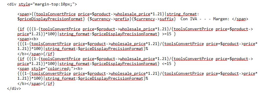 JuanjoSC Posted March 2, 2018 Author Share Posted March 2, 2018 (edited) A ver ahora, gracias @joseantgv <div style="margin-top:10px;"> <span>[spam-filter]toolsConvertPrice price=$product->wholesale_price*1.21}|string_format:$priceDisplayPrecisionFormat} {$currency->prefix}{$currency->suffix} Con IVA - - - Margen: </span> {if [spam-filter]{1-{toolsConvertPrice price=$product->wholesale_price*1.21}/{toolsConvertPrice price=$product->price*1.21[spam-filter]*100}|string_format:$priceDisplayPrecisionFormat} >=15 } <span><b> [spam-filter]{1-{toolsConvertPrice price=$product->wholesale_price*1.21}/{toolsConvertPrice price=$product->price*1.21[spam-filter]*100}|string_format:$priceDisplayPrecisionFormat}% </b></span>{/if} {if [spam-filter]{1-{toolsConvertPrice price=$product->wholesale_price*1.21}/{toolsConvertPrice price=$product->price*1.21[spam-filter]*100}|string_format:$priceDisplayPrecisionFormat} <=15 } <span style="color:red;"><b> [spam-filter]{1-{toolsConvertPrice price=$product->wholesale_price*1.21}/{toolsConvertPrice price=$product->price*1.21[spam-filter]*100}|string_format:$priceDisplayPrecisionFormat}% </b></span>{/if} </div> Edited March 2, 2018 by JuanjoSC El filtro anti span se carga el código (see edit history) Link to comment Share on other sites More sharing options...