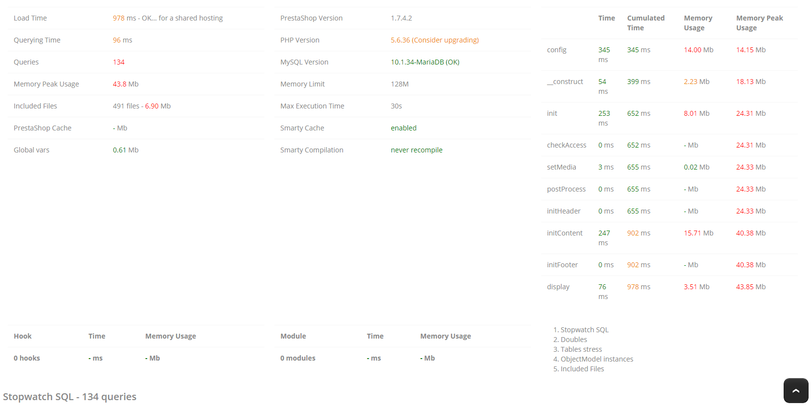 Ciekawostką jest to że jeżeli w wydajności przestawię opcję Wyłącz moduły nie od PrestaShop na tak wówczas uzyskuję czasy na poziomie 200ms - 300ms