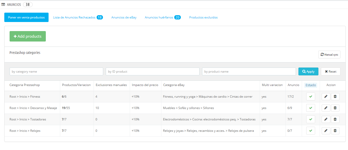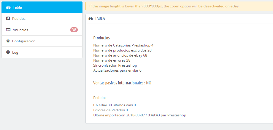 joseg Posted March 7, 2018 Share Posted March 7, 2018 Muy buenos días. Versión de PrestaShop 1.6.1.17 Utilizo el módulo de Ebay 2 (el de pago), está correctamente sincronizado con mi cuenta y tienda de Ebay, pero no consigo sincronizar los productos. Por un lado todos los artículos con combinaciones no se suben, todos (sillones en varios colores) tienen su EAN para cada color puesto y referencia, no falta nada, pero no se sube ni uno. También tengo un problema "genérico" que no sube artículos, el módulo dice que tengo sesenta y pico artículos en Ebay cuando tengo 17 publicados, los únicos que sincroniza, adjunto captura de los errores que da. Así mismo si elimino las categorías a sincronizar pero no elimina los anuncios, entiendo que como he eliminado "a mano" todos los anuncios para volver a empezar creo que no lo detectó, y cree que está trabajando sobre lo que había. He empleado mucho tiempo en buscar por internet qué puede pasar pero no encuentro nada que solvente mi problema, a ver si hay suerte y alguien me puede echar una mano. Link to comment Share on other sites More sharing options...