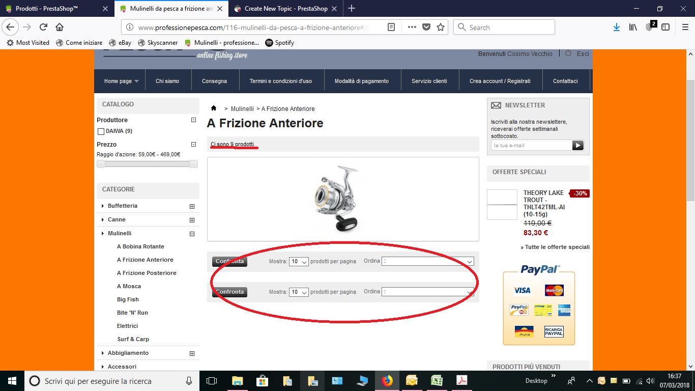 cosimovecchio Posted March 7, 2018 Share Posted March 7, 2018 Ciao a tutti, spero qualcuno possa aiutarmi e soprattutto mi auguro di essere felice nell'esposizione del problema: http://www.professionepesca.com/ questo è il sito in questione; faccio un esempio poichè l'anomalia mi si presenta per ogni categoria di prodotti: categoria "Mulinelli", poi sotto-categoria "A frizione anteriore", ecco qui mi porta (in alto) "Ci sono xx prodotti" (un numero superiore a 10, ovvero al numero di prodotti per pagina); se clicco sul numero delle pagine 2,3.. o anche su "Successivo" mi si apre una pagina con nessun prodotto. Poi solo dopo aver aggiornato la pagina (F5) mi compaiono gli altri prodotti. Che potrebbe essere? Allego anche gli screen shot. Premetto che sono abbastanza "novello" di Prestashop, per cui non termini o procedure "complicate..". Grazie Mille fin da ora. Cosimo Link to comment Share on other sites More sharing options...