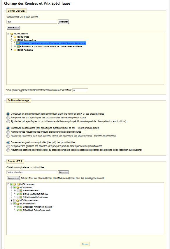 Dans le même soucis de gagner beaucoup de temps dans la gestion administrative de ma boutique, que le précédent module proposé: http://www.prestasho...ons_dattributs/ , j'ai créé cet outil vous permettant de cloner, c’est à dire de reproduire, la table des prix dégressifs depuis un produit, vers une liste au choix de produits, en un instant.