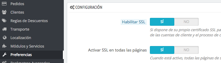 nadie Posted May 3, 2018 Share Posted May 3, 2018 hace 21 horas, GROWSHOP dijo: Hola, buenos días, Les comento lo que hice, pero, aun así, me queda un 30% para seguir pasando. Active el certificado SSL. Active las URLS amigables. Pero, aun así, no logro lo que todo quede con HTTPS aun no puedo entregar la CMR porque si o si lo tengo usar yo, por si surge algún tipo de error, lo resuelvo al momento. ¿Alguien sabe cómo resolver esto mucho más fácil y simple? GRACIAS Me alegro de que hayas resuelto el error inicial del tema, pero esta duda de SSL etc.. la tienes que escribir en nuevo tema, solo se permite 1 duda por tema, no todas en el misma tema. En Prestashop 1.7, en la pestaña Parámetros de la tienda-> Configuración tienes la opción de Habilitar SSL para todas las páginas que te comenta el compañero @nest4 en Prestashop 1.6 Por otro lado veo que usas la 1.7.1.X, recomendable actualizarlo ya a la variante actual que creo que es la 1.7.3.X, se han corregido bastantes errores y dentro de poco ya saldra la 1.7.4 y posteriores variantes.. -- Si te sale el candado amarillento en algunas partes es porque algunos recursos de la tienda (imágenes, por ejemplo) no te están cargando como seguras (no hablo de la propia sección sino de algunos recursos) Por ejemplo, en Chrome, pincha en botón derecho ratón -> Inspeccionar elemento -> Console, y revisa que errores de recursos no cargados como SSL Link to comment Share on other sites More sharing options...