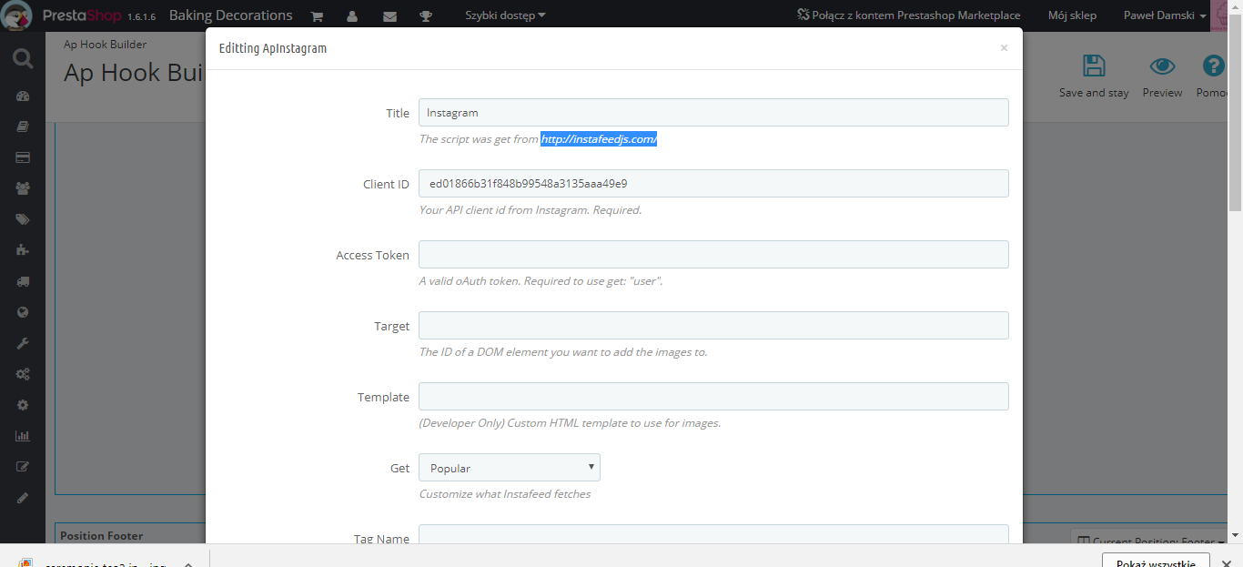 beyond13 Posted March 11, 2018 Share Posted March 11, 2018 Witam, mam problem z połączeniem instagrama i presta. Nie wiem co muszę wpisać i gdzie oraz skąd wziąć te dane - cały czas moduł nie działa tak jak powinien. Z góry dziękuję za pomoc Link to comment Share on other sites More sharing options...