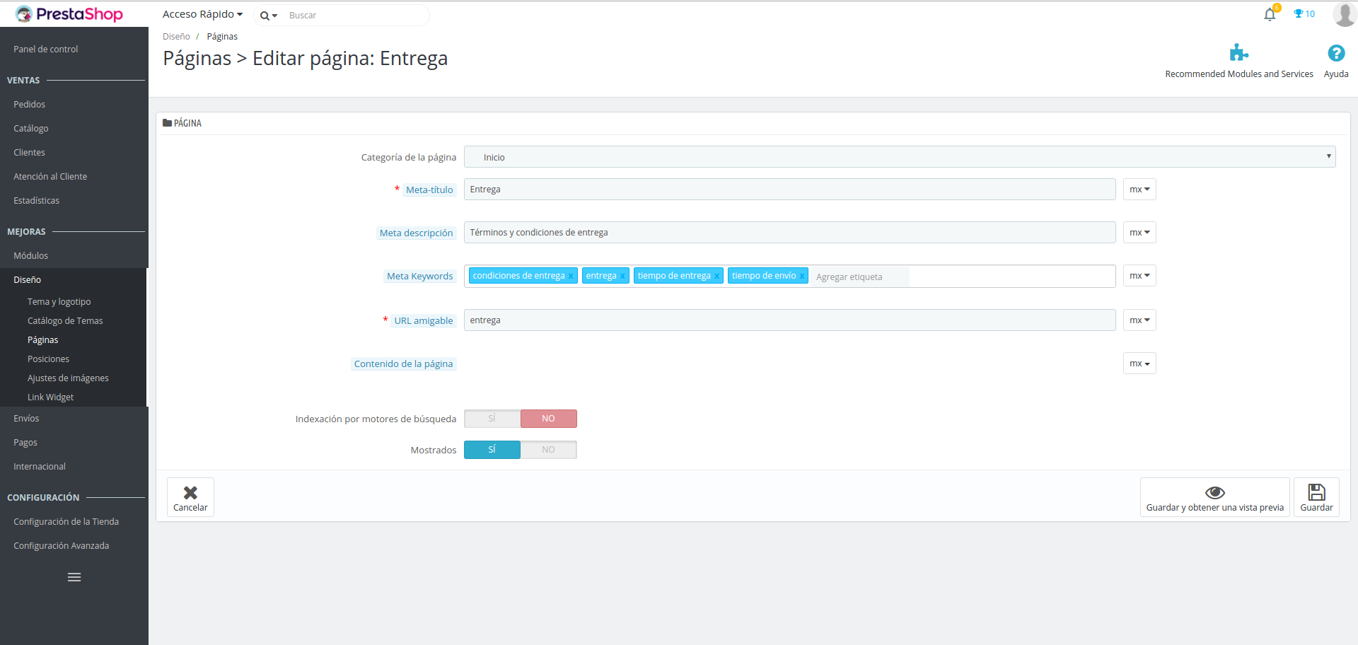 Acabo de instalar prestashop 1.7.2.4 en mi servidor y estoy iniciando su configuración. En este momento estoy intentando modificar o crear el contenido de mis páginas estáticas, pero el problema es que no puedo agregar/modificar el contenido de las mismas.