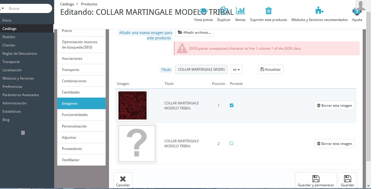 paolaprueba Posted March 17, 2018 Share Posted March 17, 2018 Hola a todos, Les escribo porque tengo un problema, llevaba varios meses sin actualizar mi web, y cuando me he puesto a actualizar productos y quise subir nuevas imagenes me he encontrado con que no puedo subir fotos porque me aparece el siguiente error: JSON.parse: unexpected character at line 1 column 1 of the JSON data Además no sólo no me sube la foto sino que se crea una especie de imagen fantasma, pueden verla en la captura de pantalla que aprece con un símbolo de pregunta. Estuve mirando en foros, y probé a reinstalar el módulo de categorías, pero nada. Por favor a ver si alguien puede ayudarme. Mi web es candypet.es y tengo prestashop 1.6.1.4 Desde ya muchas gracias a todos por su ayuda. Saludos, Paola Link to comment Share on other sites More sharing options...