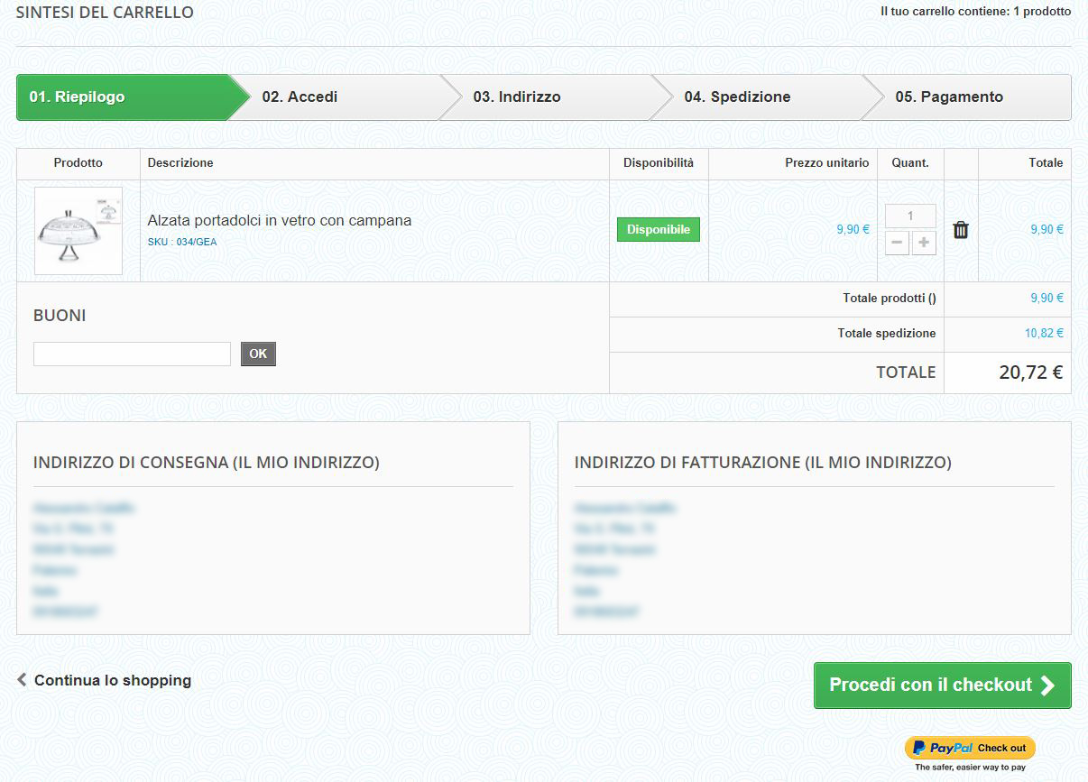 Multistoreonline Posted March 19, 2018 Share Posted March 19, 2018 Buongiorno, vorrei sapere come fare a cambiare la dicitura "Procedi con il checkout" con un più generico "Acquista" nel pulsante verde della pagina carrello, come da allegato. La versione Prestashop utilizzata è la 1.6.1.16 e il tema utilizzato è il default bootstrap. Link to comment Share on other sites More sharing options...