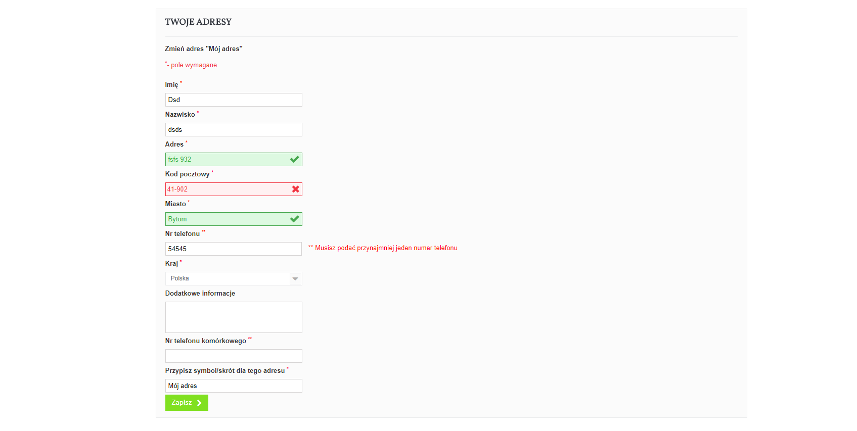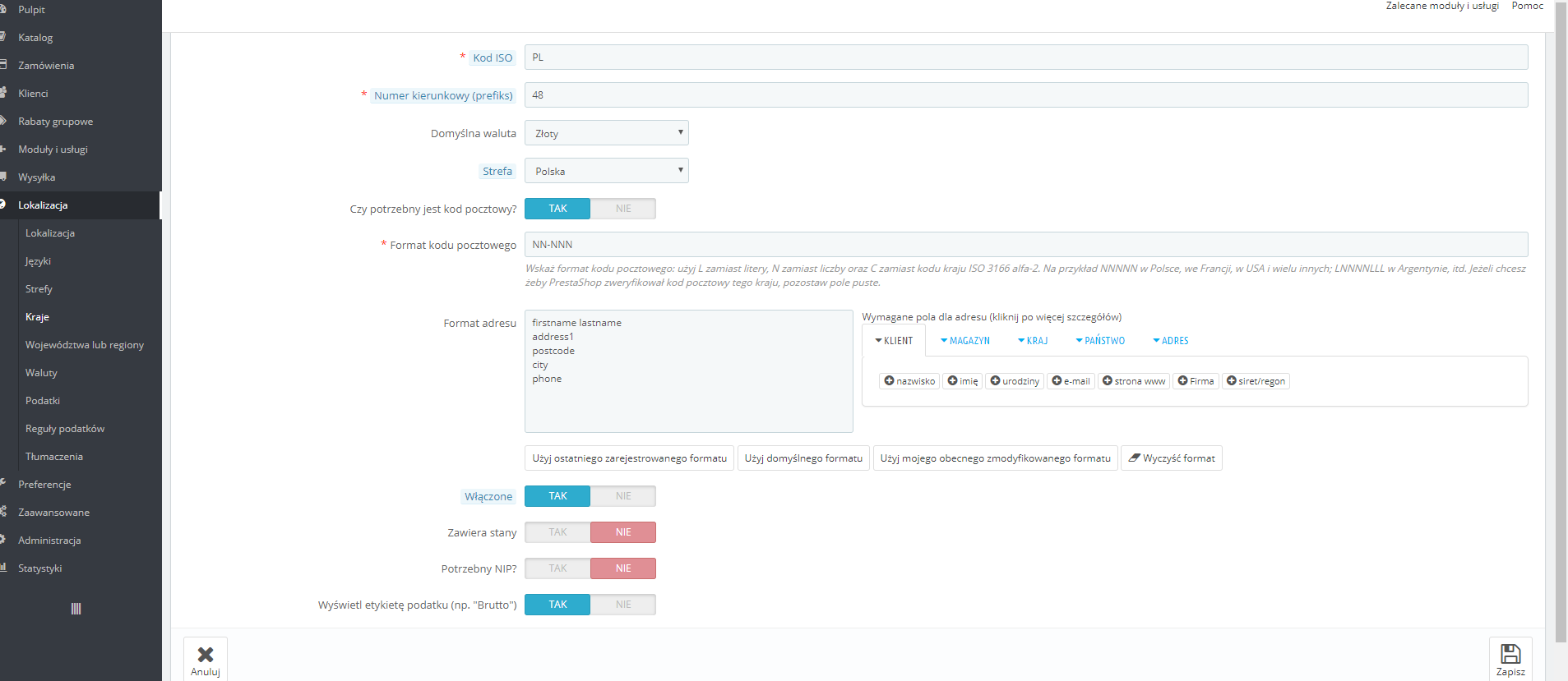 Tymczasem.. podczas wpisywania kodu pocztowego presta podkreśla mi całe pole na czerwono nie wiedzieć czemu... kod pocztowy kraju ustawiony dobrze. Dodatkowo, ustawione mam tylko kilka pozycji w adresie a presta dodaje sobie co chce przy wypełnianiu...