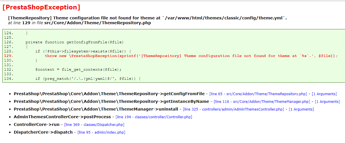 Kaluaris Posted March 20, 2018 Share Posted March 20, 2018 (edited) Hey Leute, ich hab folgendes Problem... Ich hab mir ein Template gekauft. Nach der Installation lief einfach gar nichts mehr, habe das dann einfach im ftp gelöscht, wie DÄMLICH, ich weis! Jetzt bekomme ich allerdings immer folgende Dinge angezeigt nachdem ich versuche das alte Template natürlich auch aus dem System zu löschen. Denn nun kann ich weder ein neues Template installieren noch kann ich irgendeins löschen. Alle Änderungen in dem Bereich "DESIGN" werden einfach nicht gespeichert. !Bilder Strecke im Anhang! Kurz und Knapp Hier meine FRAGE: Wo finde ich die Datei oder den Ort an dem ich händisch den Pfad ändern kann welches Template er benutzen soll. Habe einige Dateien durchgeschaut aber finde immer nur Verlinkungen wie diese: use PrestaShop\PrestaShop\Core\Addon\Theme\Theme; use PrestaShop\PrestaShop\Core\Addon\Theme\ThemeChecker; Hier nochmal die komplette Fehlermeldung "aufgedeckt": [PrestaShopException] [ThemeRepository] Theme configuration file not found for theme at `/var/www/html/themes/foliage/config/theme.yml`.at line 129 in file src/Core/Addon/Theme/ThemeRepository.php 124. } 125. 126. private function getConfigFromFile($file) 127. { 128. if (!$this->filesystem->exists($file)) { 129. throw new \PrestaShopException(sprintf('[ThemeRepository] Theme configuration file not found for theme at `%s`.', $file)); 130. } 131. 132. $content = file_get_contents($file); 133. 134. if (preg_match('/.\.(yml|yaml)$/', $file)) { PrestaShop\PrestaShop\Core\Addon\Theme\ThemeRepository->getConfigFromFile - [line 65 - src/Core/Addon/Theme/ThemeRepository.php] - [1 Arguments] 60. } 61. 62. if ($this->filesystem->exists($jsonConf)) { 63. $data = $this->getConfigFromFile($jsonConf); 64. } else { 65. $data = $this->getConfigFromFile($dir.'/config/theme.yml'); 66. } 67. 68. $data['directory'] = $dir; 69. 70. return new Theme($data); PrestaShop\PrestaShop\Core\Addon\Theme\ThemeRepository->getInstanceByName - [line 491 - classes/shop/Shop.php] - [1 Arguments] 486. $db = Db::getInstance(); 487. $themeRepository = (new PrestaShop\PrestaShop\Core\Addon\Theme\ThemeManagerBuilder($context, $db))->buildRepository($this); 488. if (empty($this->theme_name)) { 489. $this->theme_name = 'classic'; 490. } 491. $this->theme = $themeRepository->getInstanceByName($this->theme_name); 492. } 493. 494. /** 495. * Get theme directory name 496. * ShopCore->setTheme - [line 135 - classes/shop/Shop.php] 130. parent::__construct($id, $id_lang, $id_shop); 131. 132. if ($this->id) { 133. $this->setUrl(); 134. if ($this->theme == NULL) { 135. $this->setTheme(); 136. } 137. } 138. } 139. 140. /** ShopCore->__construct - [line 414 - classes/shop/Shop.php] - [1 Arguments] 409. } 410. } else { 411. $shop = new Shop($id_shop); 412. if (!Validate::isLoadedObject($shop) || !$shop->active) { 413. // No shop found ... too bad, let's redirect to default shop 414. $default_shop = new Shop(Configuration::get('PS_SHOP_DEFAULT')); 415. 416. // Hmm there is something really bad in your Prestashop ! 417. if (!Validate::isLoadedObject($default_shop)) { 418. throw new PrestaShopException('Shop not found'); 419. } ShopCore::initialize - [line 120 - config/config.inc.php] 115. 116. $context = Context::getContext(); 117. 118. /* Initialize the current Shop */ 119. try { 120. $context->shop = Shop::initialize(); 121. } catch (PrestaShopException $e) { 122. $e->displayMessage(); 123. } 124. define('_THEME_NAME_', $context->shop->theme->getName()); 125. define('_PARENT_THEME_NAME_', $context->shop->theme->get('parent') ?: ''); require - [line 27 - index.php] - [1 Arguments] 22. * @copyright 2007-2017 PrestaShop SA 23. * @license http://opensource.org/licenses/osl-3.0.php Open Software License (OSL 3.0) 24. * International Registered Trademark & Property of PrestaShop SA 25. */ 26. 27. require(dirname(__FILE__).'/config/config.inc.php'); 28. Dispatcher::getInstance()->dispatch(); WO KANN ICH DEN PFAD ZU DEM TEMPLATE ÄNDERN UM MANUEL DAS PROBLEM SCHNELL ZU FIXXEN? Danke jetzt schon einmal für eventuelle Hilfe Edited March 20, 2018 by Kaluaris (see edit history) Link to comment Share on other sites More sharing options...