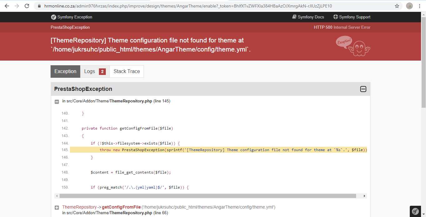 129.             throw new \PrestaShopException(sprintf('[ThemeRepository] Theme configuration file not found for theme at `%s`.', $file));