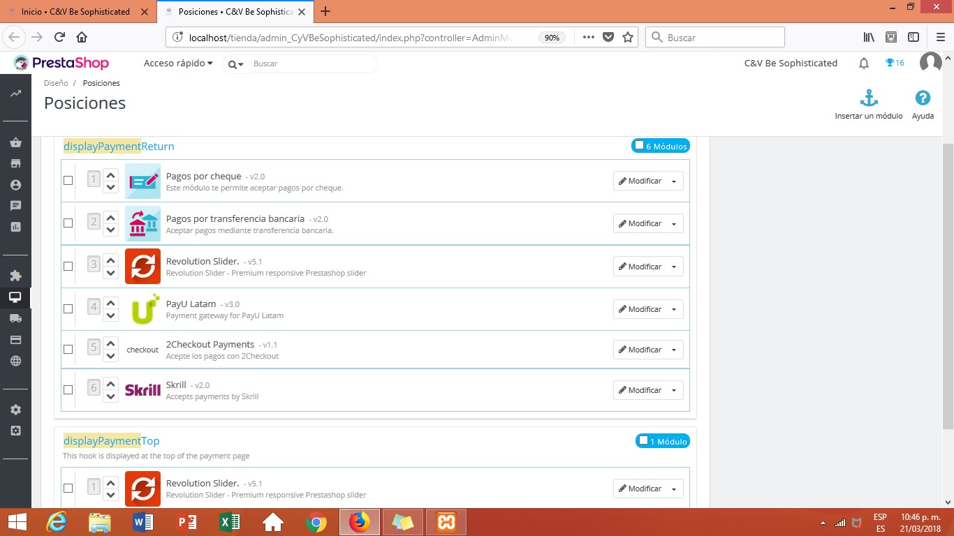 Ya fui a la seccion de modulos de pago en Prestashop y la unica que me aparece activa es PayPal y Skrill, esas si me da la opcion de desactivarlas o configurarlas.